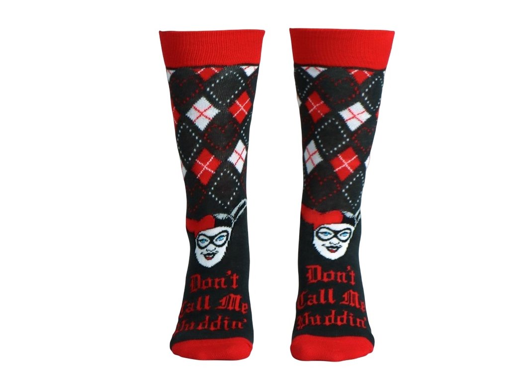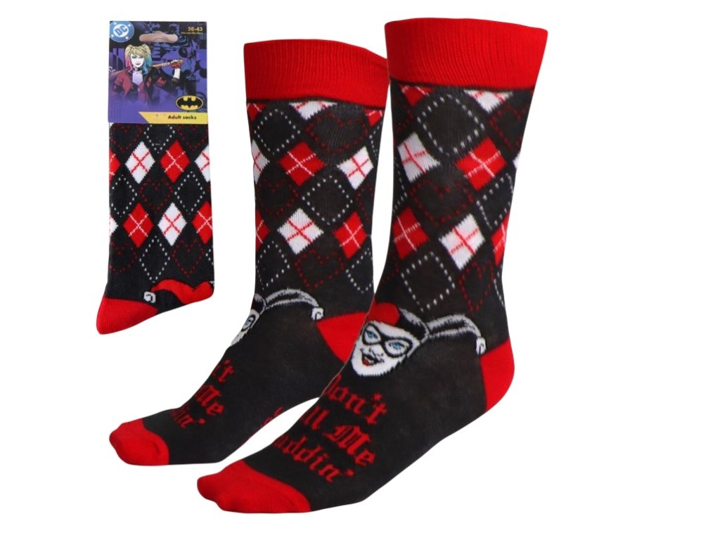Stylové dámské ponožky s motivem ikonické komiksové antihrdinky Harley Quinn ze světa DC Comics. Kombinace červené a černé barvy spolu s výrazným designem dodá vašemu outfitu hravý a originální nádech. Ponožky jsou příjemné na nošení a skvěle se hodí na každodenní použití doma, do práce i na volný čas. Ideální doplněk pro všechny fanoušky Harley Quinn, kteří chtějí ukázat svou oblíbenou postavu i v detailech svého stylu.
