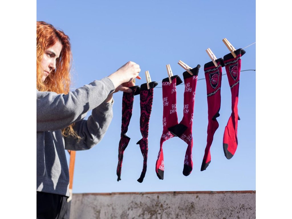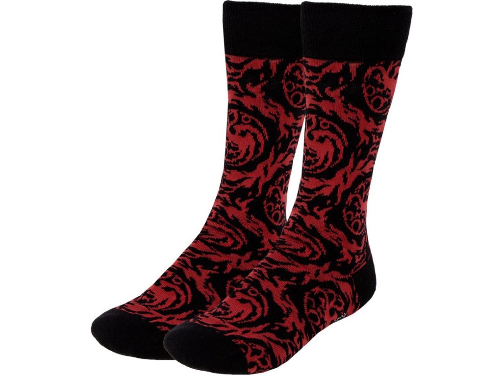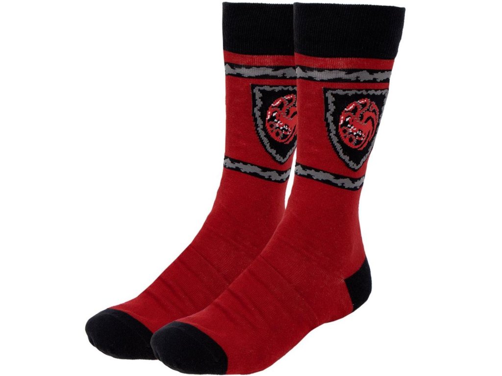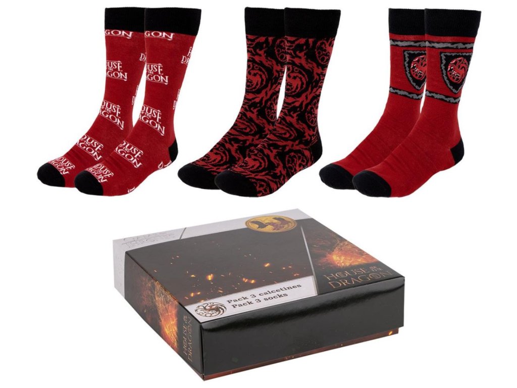 Dárkový set 3 párů atraktivních dámských červeno-černých ponožek s motivem oblíbeného seriálu Rod draka. Ponožky jsou vhodným doplňkem každého velkého fanouška tohoto seriálu a rozhodně ozvláštní váš každodenní outfit.