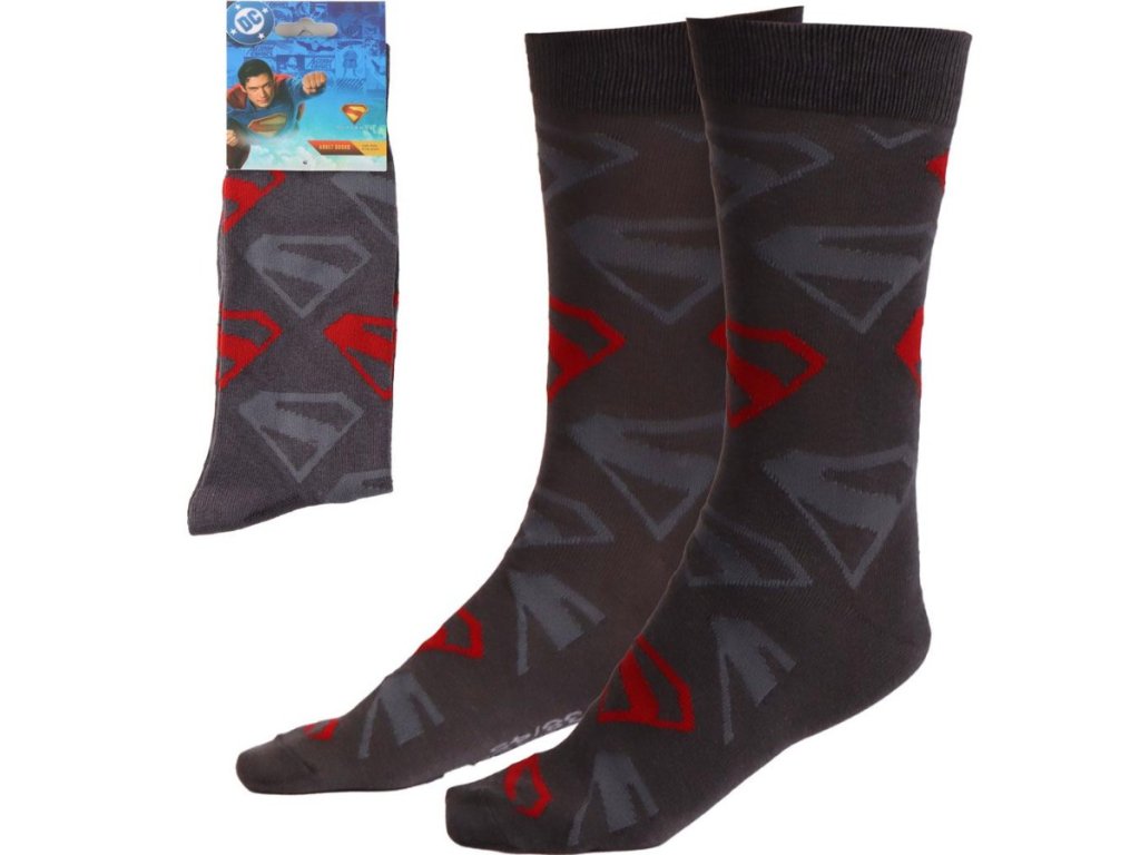Pár atraktivních šedých unisex ponožek s motivem loga superhrdiny Superman. Ponožky jsou vhodným doplňkem každého velkého fanouška této postavy, ale i pro svérazné jedince.