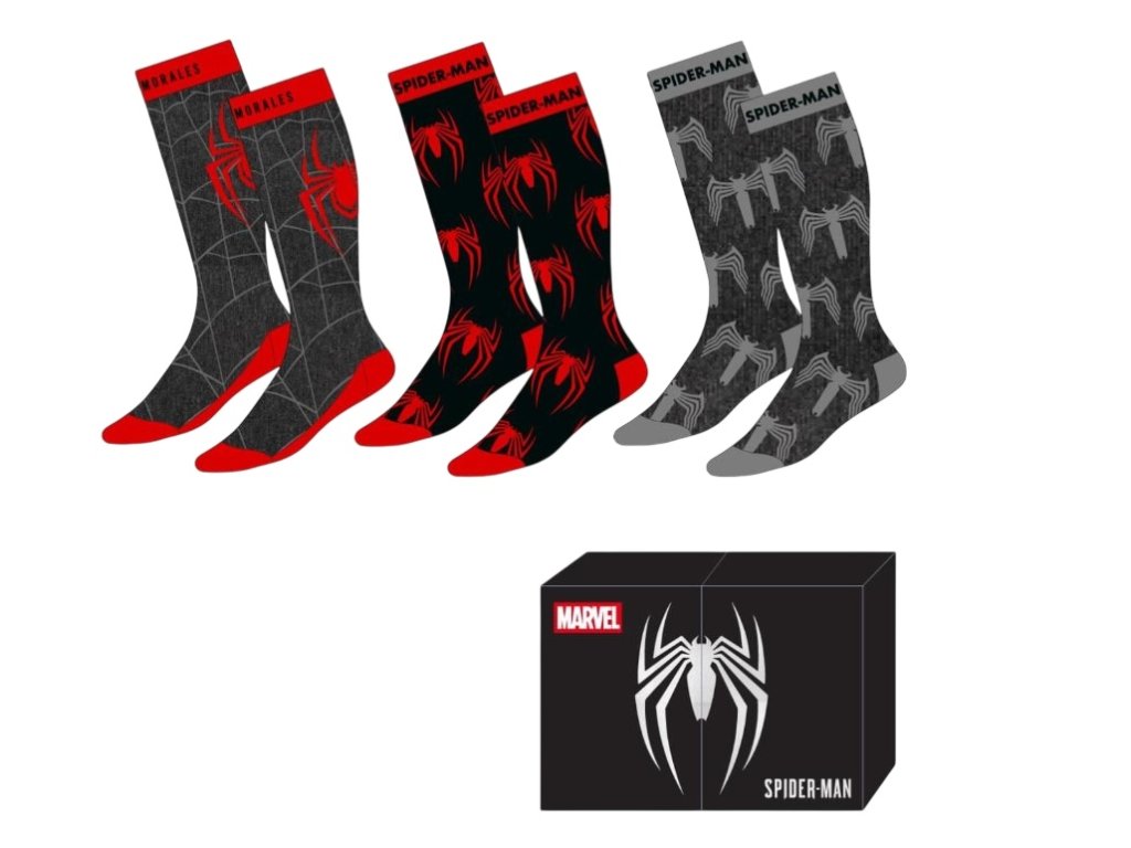 Oficiální produkt - set 3 párů pánských ponožek a doplňkové zboží z katalogu výrobků s grafikou, motivem a licencí populární postavy komiksových příběhů Spiderman vydávaných nakladatelstvím Marvel.