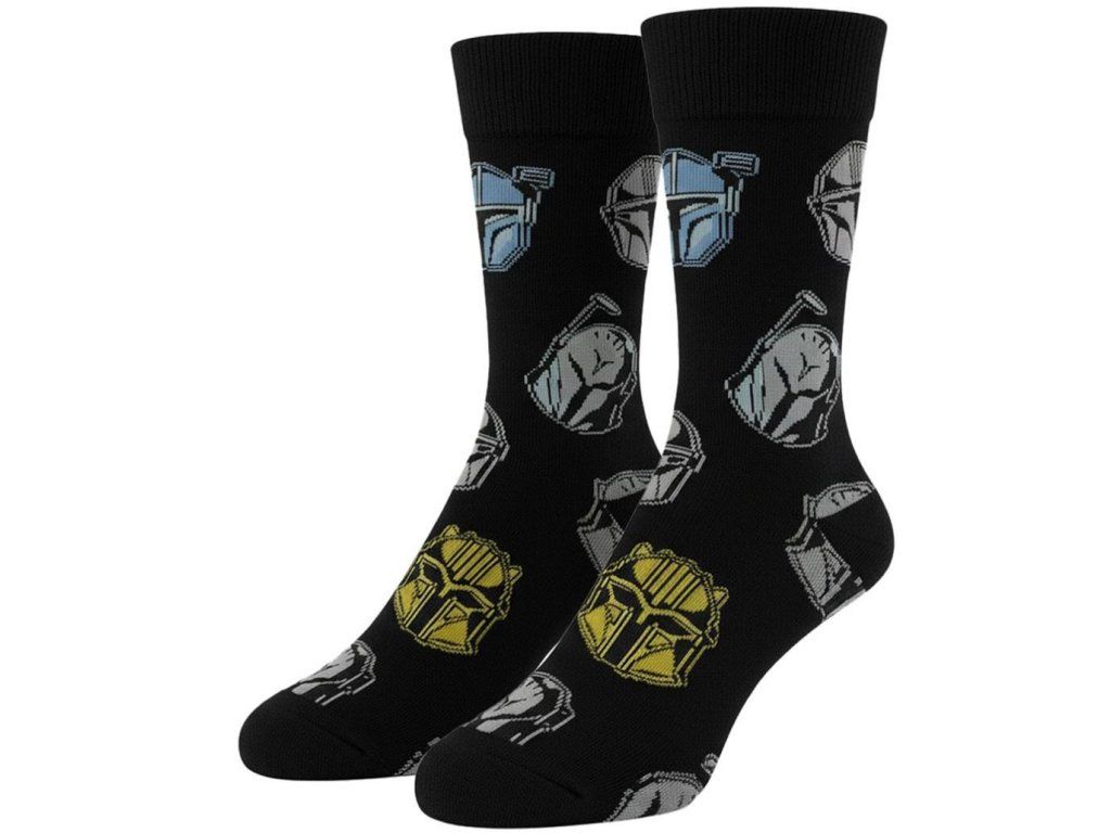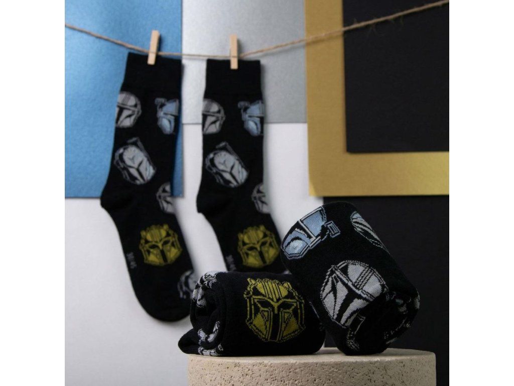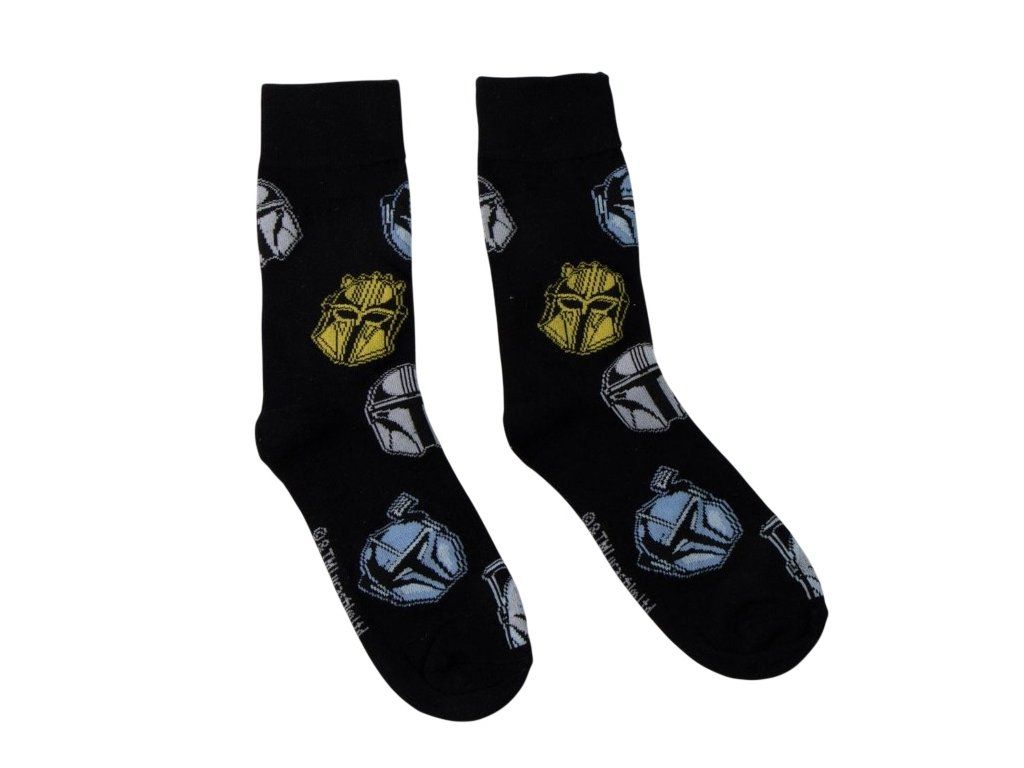 Doplňte svůj outfit decentním, ale originálním kouskem. Tyto černé ponožky s motivem helem ze seriálu The Mandalorian kombinují kvalitní úplet s moderním popkulturním designem. S těmito ponožkami nešlápnete vedle. Motiv mandalorianského brnění je symbolem odolnosti a cti - vlastností, které ocení každý moderní rytíř Jedi. Pro každého fanouška ságy Star Wars, který si potrpí na detaily.