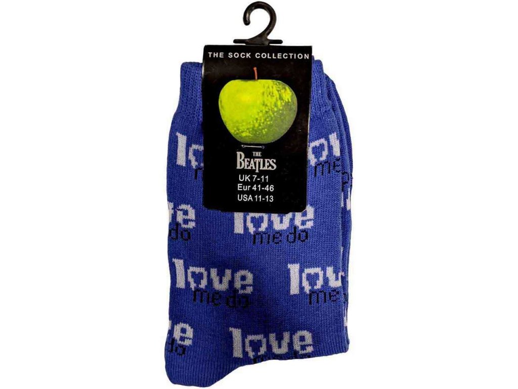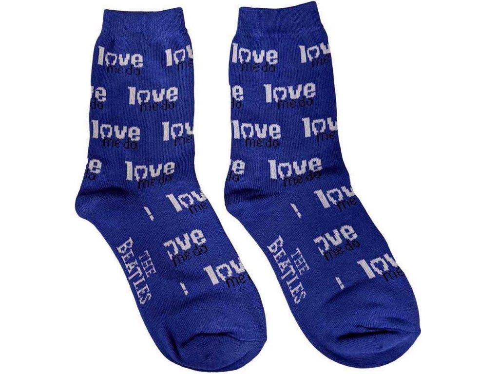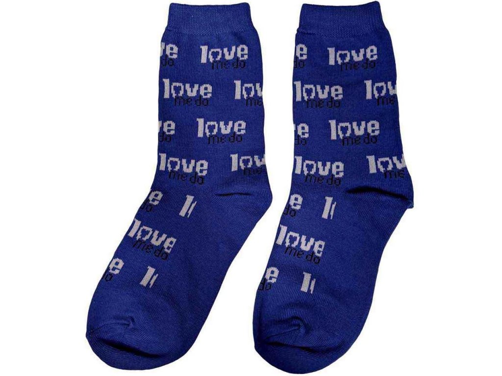 Modrý pár ponožek inspirovaný hudební skupinou The Beatles a motivem Love me Do.