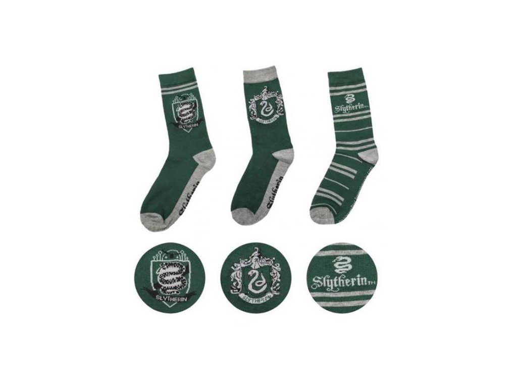 Set 3 párů ponožek s grafikou Bradavické koleje Zmijozel. Přiřadil tě moudrý klobouk do Zmijozelu? Poté jsou tyto zelené ponožky nutností tvého šatníku! Tyto ponožky dodají styl každodennímu outfitu. Navíc v klasické zelené barvě budeš vidět a tak se v davu nikdy neztratíš.