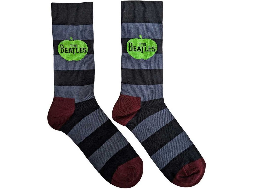Pár šedých vysokých unisex ponožek vyvedených s pruhy a logem jablka od kapely The Beatles, což byla anglická rocková skupina z Liverpoolu. Jejími členy byli John Lennon, Paul McCartney, George Harrison a Ringo Starr. Ponožky jsou vhodným dárkem pro každého hudebního fanouška.