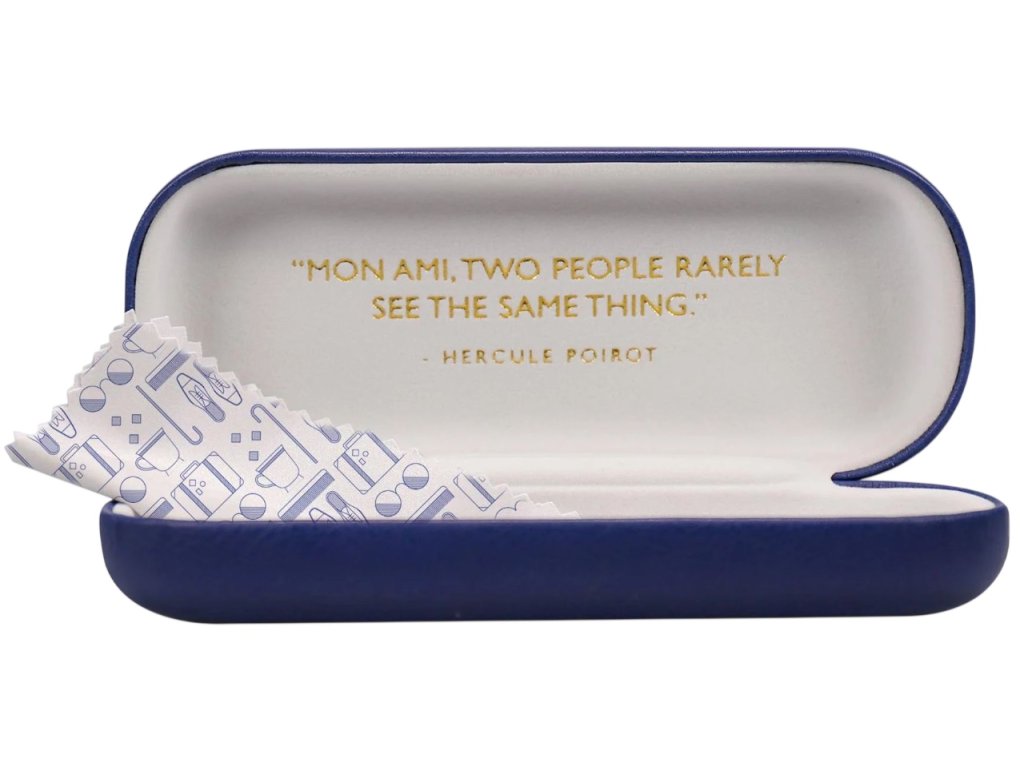 Modré pouzdro na brýle s grafikou brýlí a nápisem fiktivní knižní postavy Hercule Poirot. Součástí pouzdra je i hadříček na čištění sklíček ve stejném designu. Uvnitř pouzdra najdete tkaninu, která se postará o pohodlí vašich brýlí. Pouzdro je vhodné pro všechny, kteří mají rádi umění a styl, nebo si jenom chtějí uschovat své brýle, jak už klasické, tak sluneční.