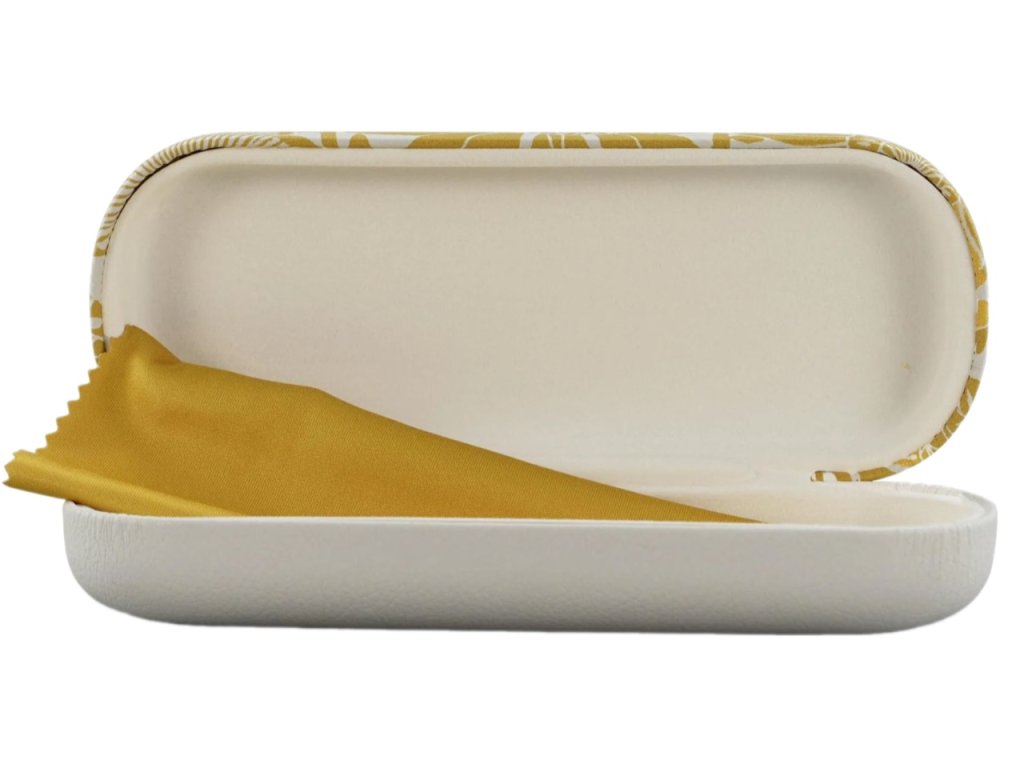 Bílo-žluté pouzdro na brýle s grafikou návrhu od slavné britské grafičky Kate Heiss. Součástí pouzdra je i hadříček na čištění sklíček ve stejném designu. Uvnitř pouzdra najdete tkaninu, která se postará o pohodlí vašich brýlí. Pouzdro je vhodné pro všechny, kteří mají rádi umění a styl, nebo si jenom chtějí uschovat své brýle, jak už klasické, tak sluneční.