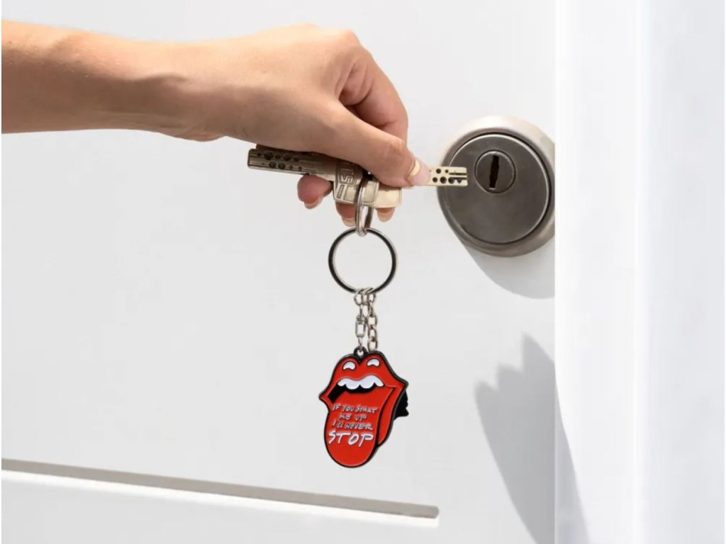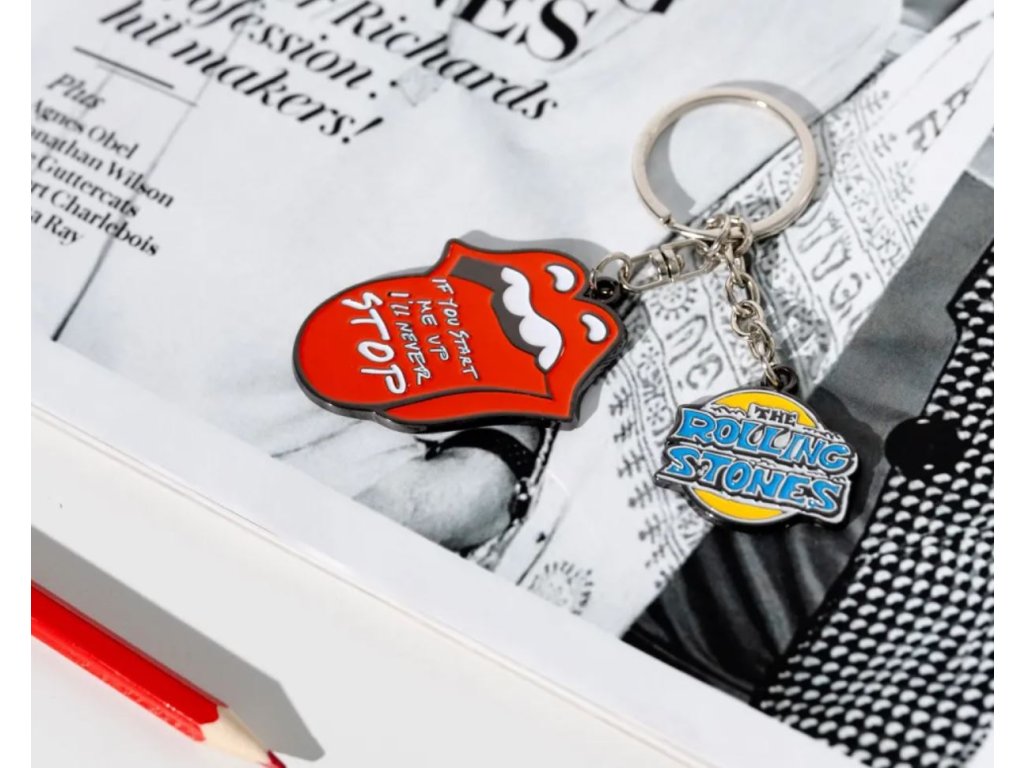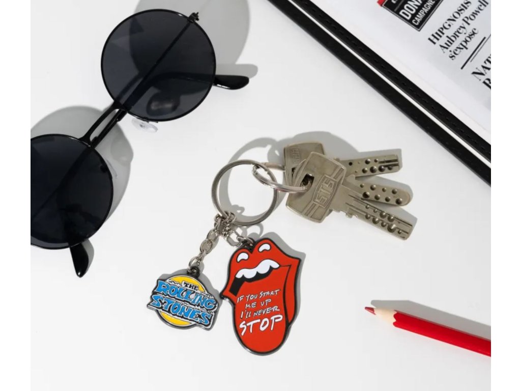 Oficiální produkt - přívěsek na klíče z katalogu výrobků s logem, fotografiemi a grafikou britské rockové hudební skupiny The Rolling Stones.