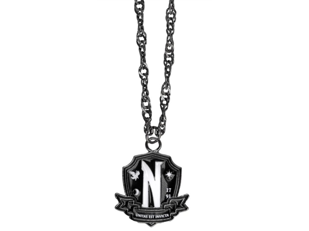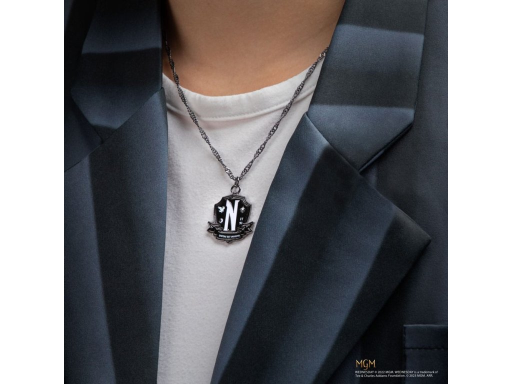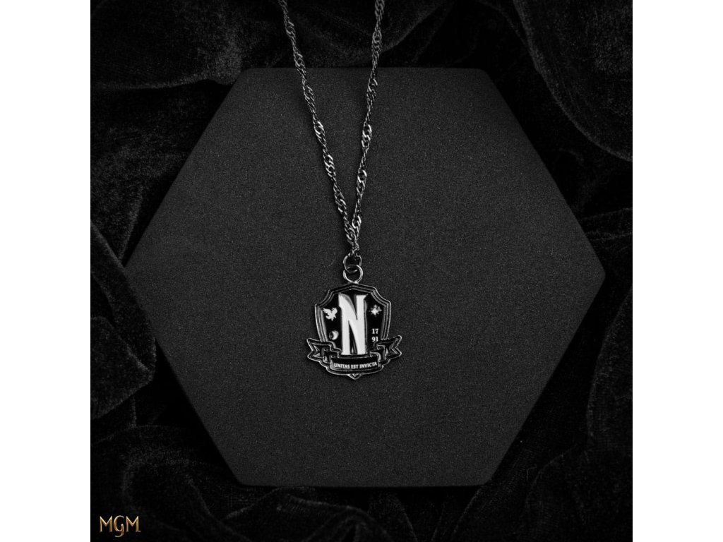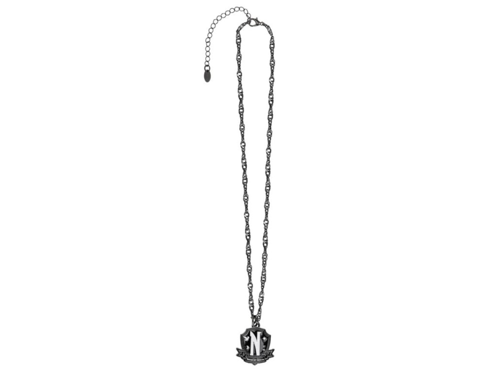 Atraktivní řetízek na krk s přívěskem v grafice erbu akademie Nikdyvíc (Nevermore Academy), kam chodila Wednesday Addamsové v seriálu Wednesday od společnosti Netflix. Řetízek je vhodným doplňkem každého správného fanouška.