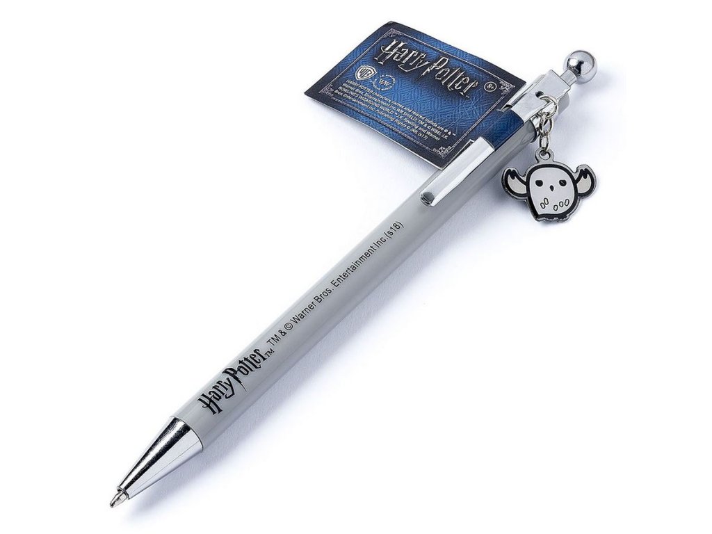 Šedá plastová propiska s grafikou filmové ságy o Harrym Potterovi a přívěškem na propisce Harryho sovy Hedwig.