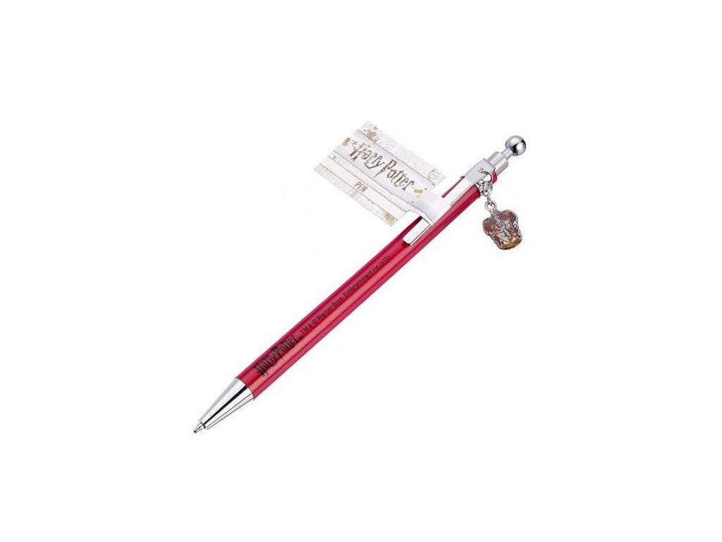 Červená plastová propiska s grafikou filmové ságy o Harrym Potterovi a znakem koleje Nebelvír.