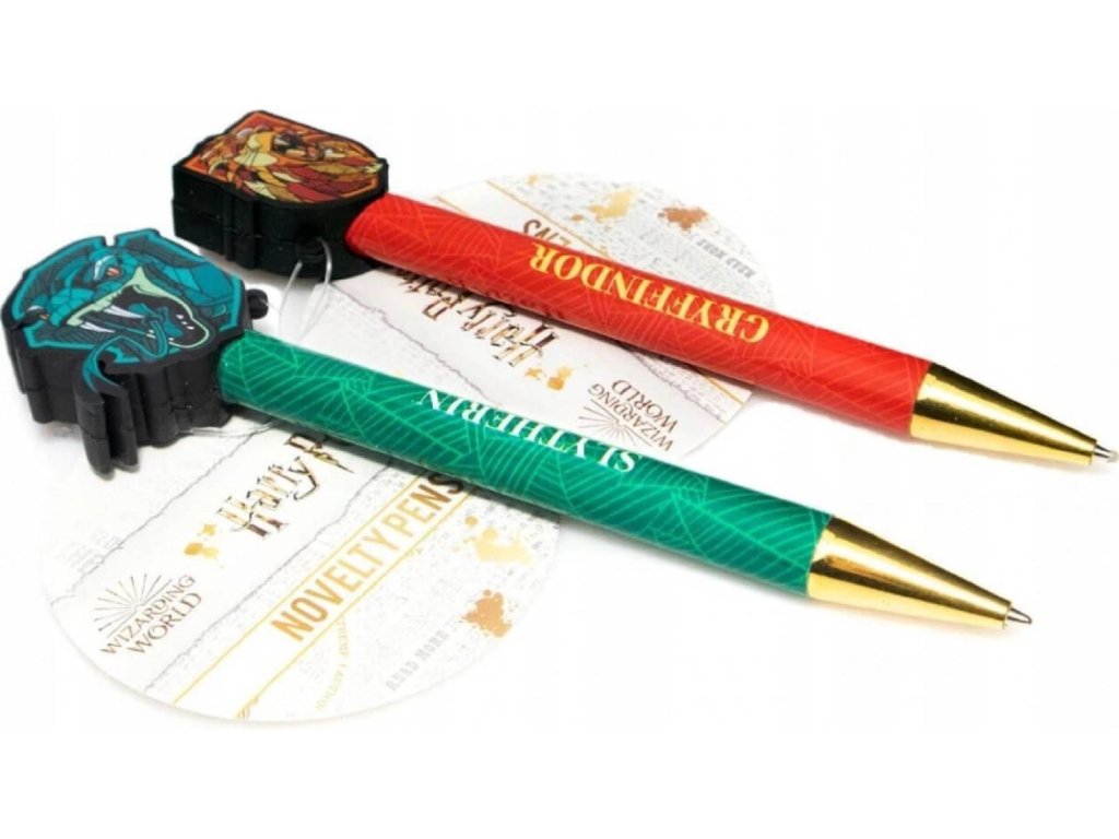 Stylový set 2 propisek s motivy kolejí Nebelvír a Zmijozel potěší každého fanouška kouzelnického světa. Každá propiska je zakončena výrazným 3D erbem koleje, hrdým lvem a ikonickým hadem. Tělo propisky působí elegantně a pevně, zároveň se pohodlně drží při psaní. Díky kvalitnímu zpracování jsou propisky vhodné do školy, kanceláře i jako reprezentativní doplněk na pracovní stůl. Perfektní dárek pro každého, kdo má jasno v tom, kam patří, ať už do Nebelvíru nebo Zmijozelu.
