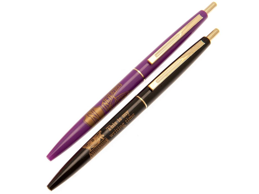 Balení dvou kusů plastových propisek v černé a fialové barvě s grafikou školy Nikdyvíc ze seriálu Wednesday. Propisky jsou vhodným psacím prostředkem každého menšího i většího fanouška.