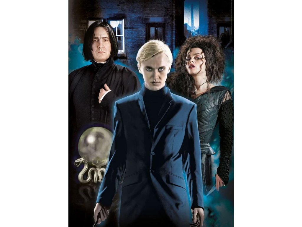 - puzzle s grafikou záporných postav: Draca Malfoye, Bellatrix Lestrageové a Severuse Snapea