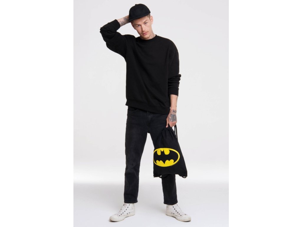 Černý pytlík s logem Batman. Pytlík se stahovacími šňůrkami je vhodný na trepky, sportovní potřeby nebo sportovní oblečení.