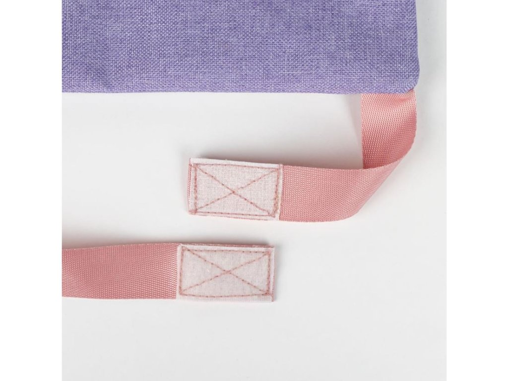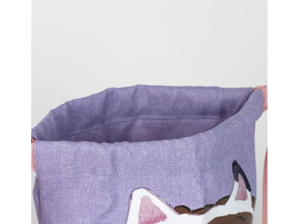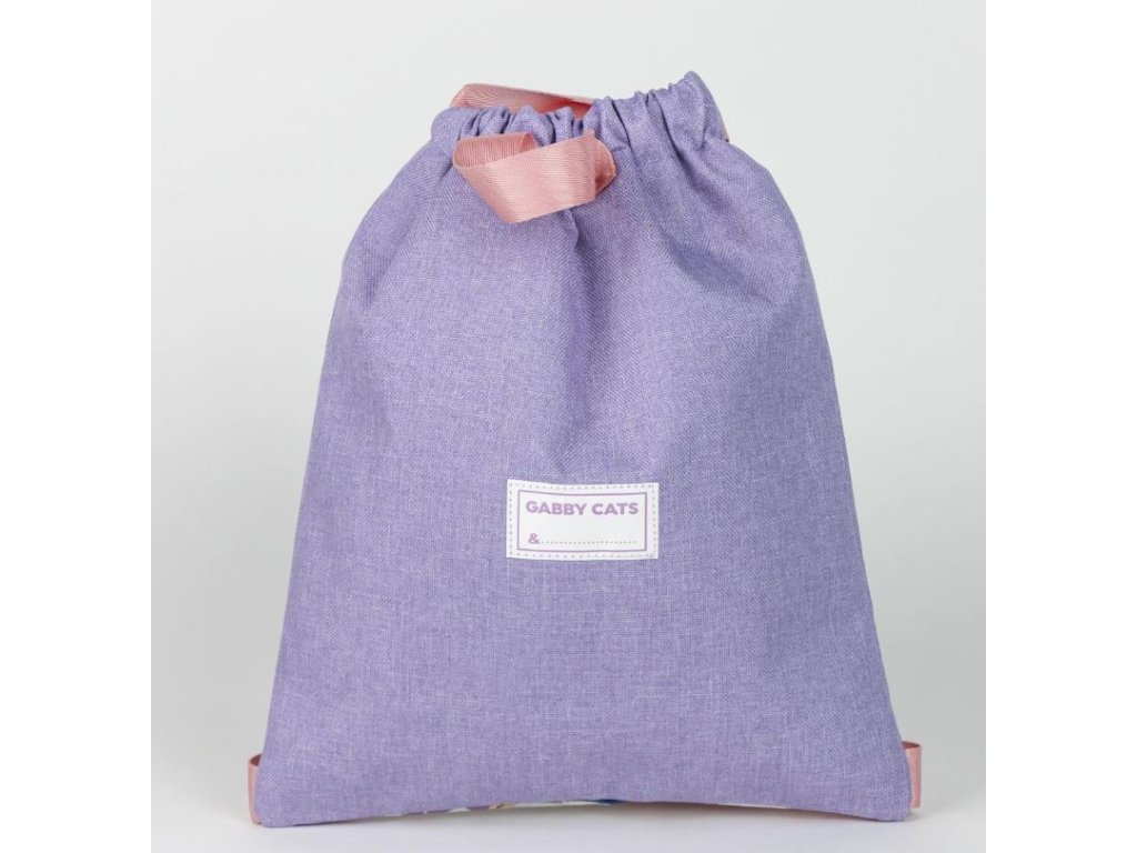 Fialový gym pytlík s grafikou kamarádů od Gábi z dětského seriálu Gabby's Dollhouse (Gábinin kouzelný domek). Pytlík se stahovacími šňůrkami je vhodný na trepky, sportovní potřeby nebo sportovní oblečení.