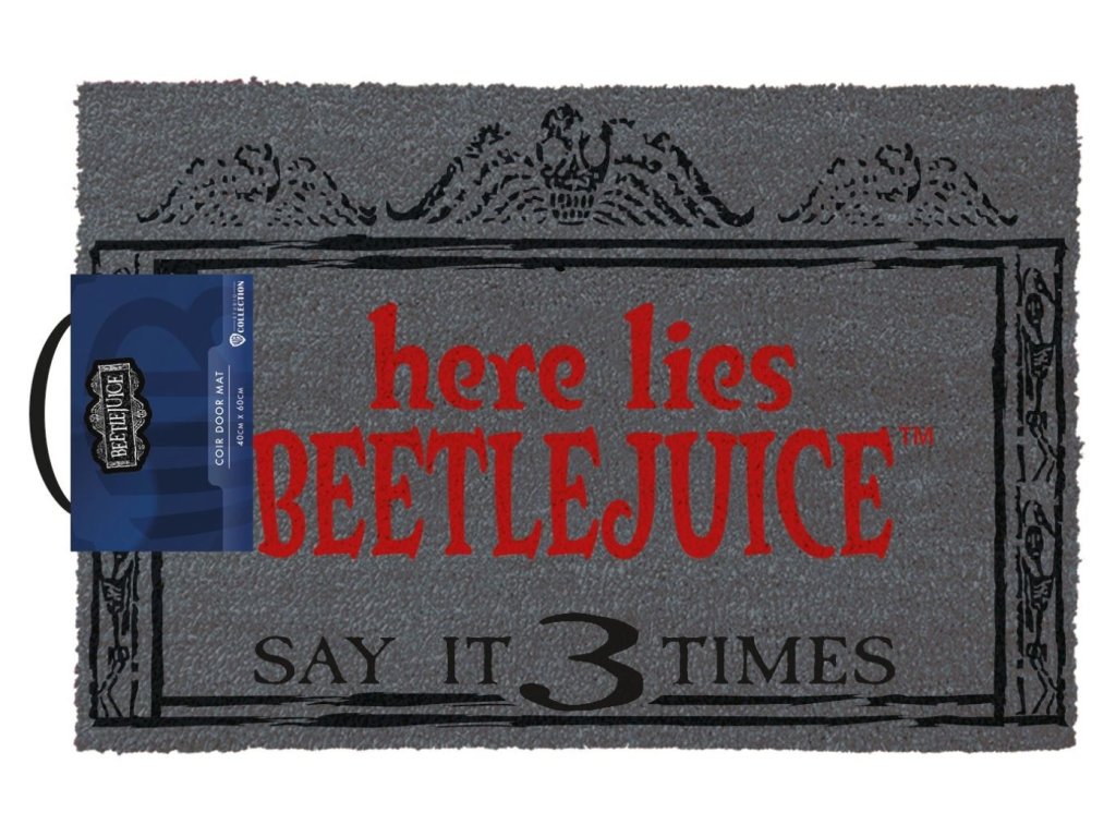 Rohožka s atraktivním vzhledem a nápisem Here lies Beetlejuice. Say it 3 times. Tato zajívavá rozhožka dodá vaším hlavním dvěří kousek tajemna a je vhodná pro každého fanouška šílence Beetlejuice.