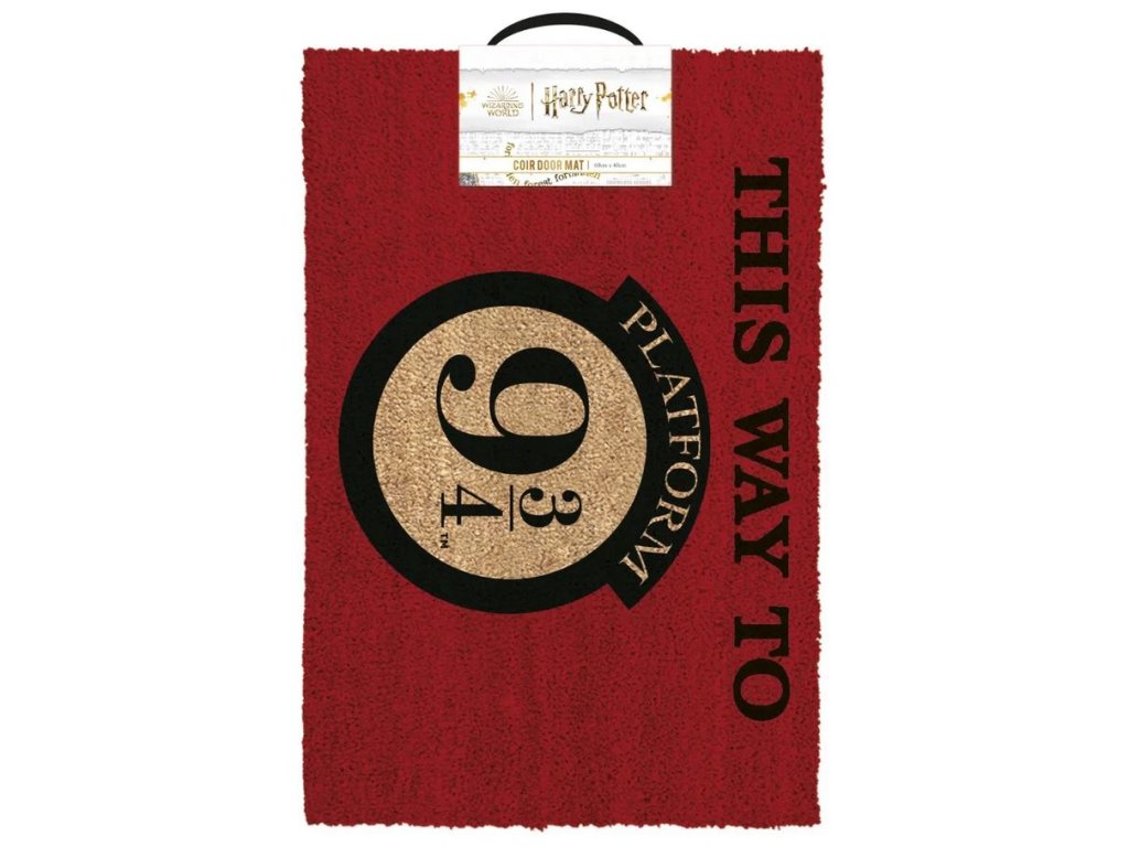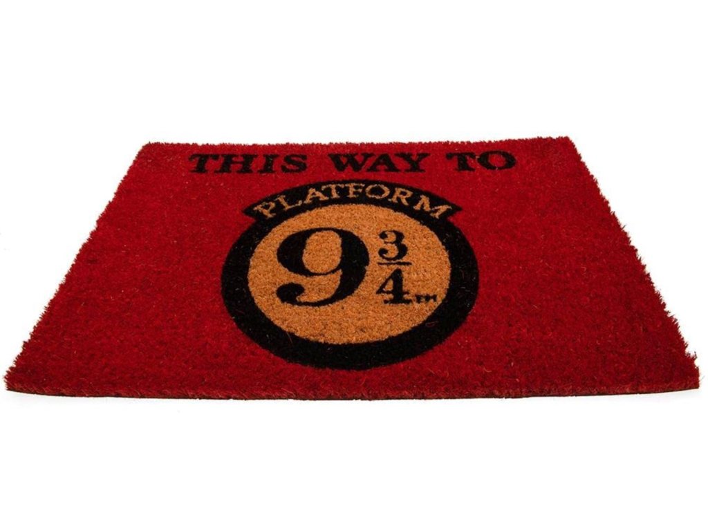 Tmavě hnědá rohožka s grafikou a nápisem: ,,Tahle cesta vede k nástupišti 9 3/4. Rohožka je vhodným doplňkem vchodových dveří pro každého menšího i většího fanouška ságy Harryho Pottera.