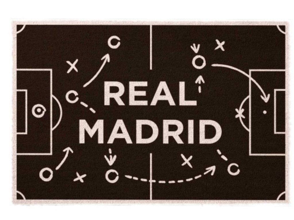 Černá rohožka s grafikou hřiště a taktiky hry v zápasu s nápisem Real Madrid. Rohožka je vhodným doplňkem vchodových dveří každého fotbalového nadšence. Ukažte všem jakému fotbalovému klubu fandíte. Tato rohožka rozhodně zaujme na první pohled a všem nastíní jak velkým fotbalovým fanouškem jste.
