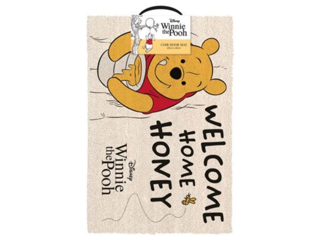 Béžová rohožka s grafikou Medvídka Pů a nápisem Welcome home honey. Rohožka je vhodným doplňkem vchodových dveří pro každého menšího i většího fanouška pohádky Medvídek Pů.