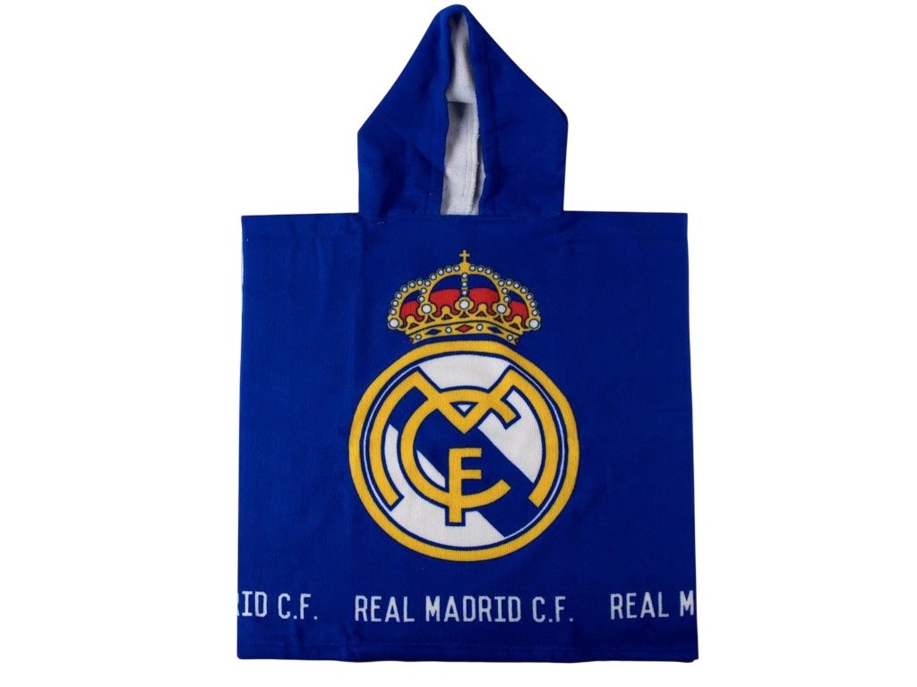 Oficiální produkt - dětský ručník-pončo z katalogu dárkových výrobků s grafikou a licencí populárního fotbalového španělského klubu Real Madrid.