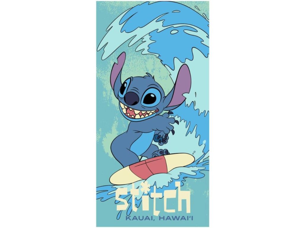 Atraktivní ručník modré barvy s motivem Stitche jak surfuje. Licenční osuška potěší všechny malé i velké milovníky pohádky Lilo a Stitch a především fanoušky postavičky mimozemšťana Stitche.