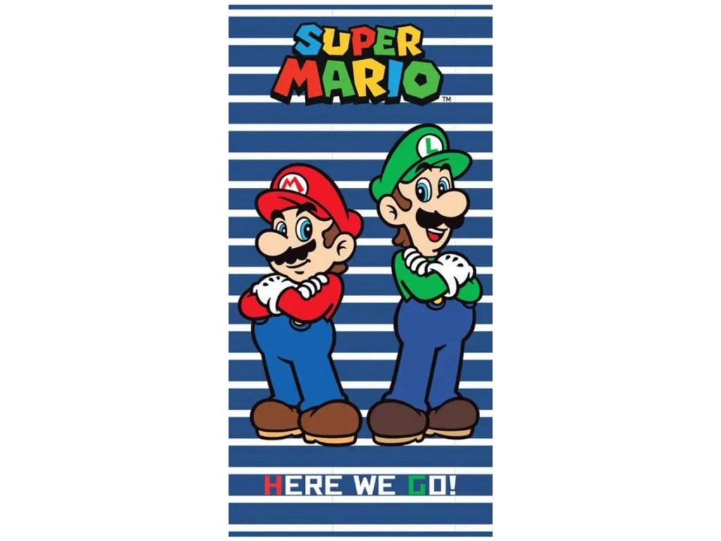 Bavlněná tmavě modrá osuška s bílými pruhy a grafikou postav Maria a Luigiho ze hry Super Mario. Ručník je vhodným dárkem pro všechny fanoušky.
