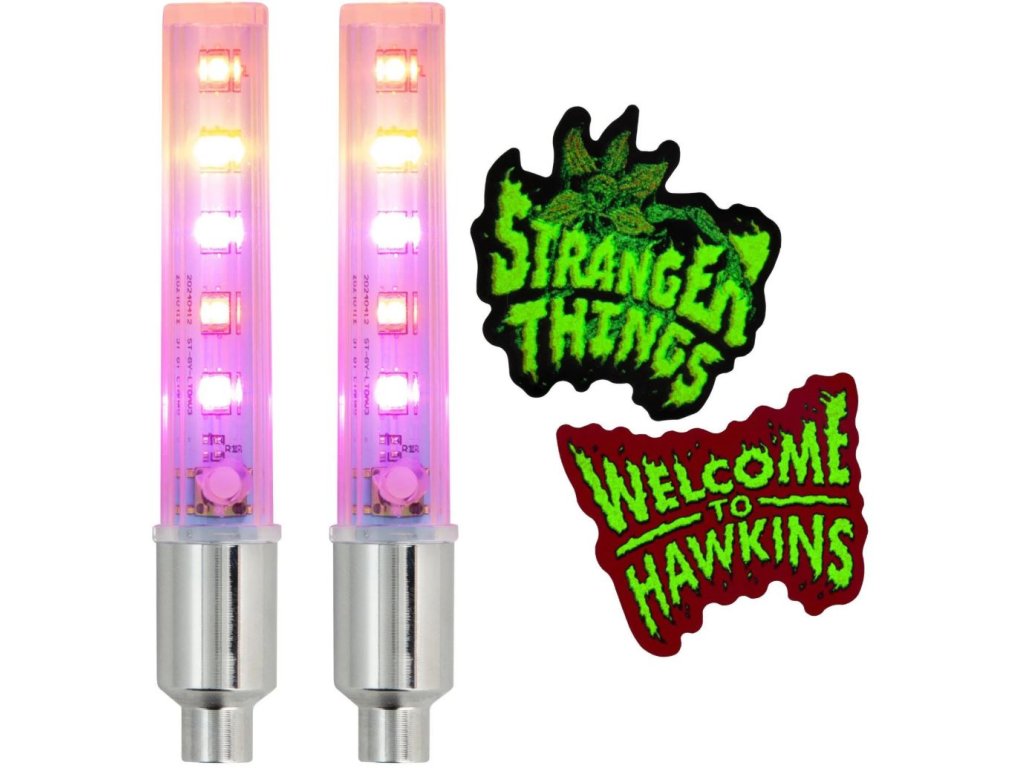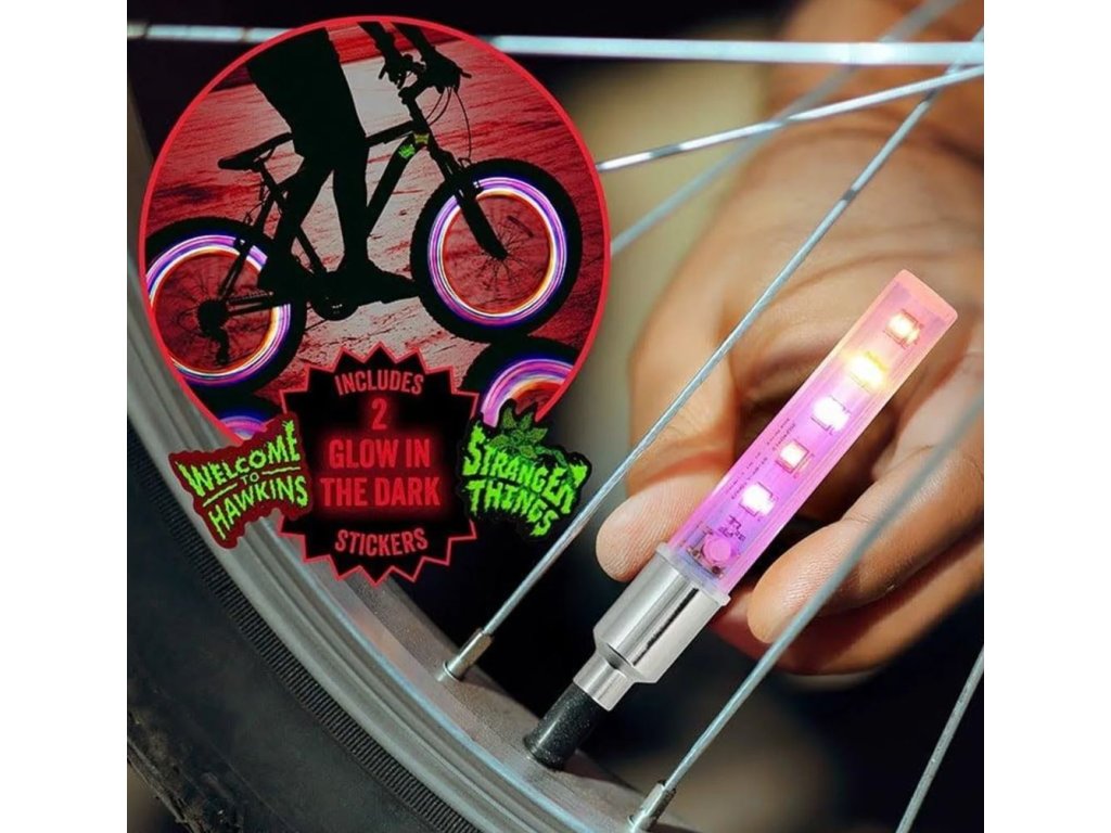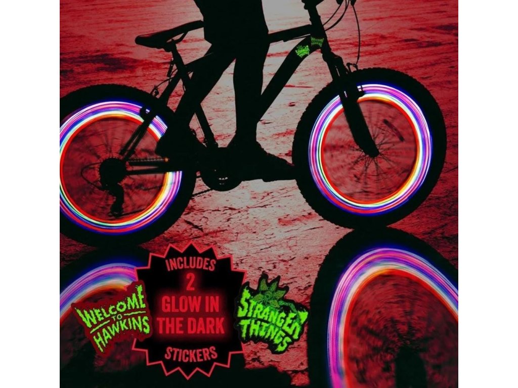 Set dekorativního LED osvětlení a svítících samolepek s grafikou ze seriálu Stranger Things. Sada obsahuje 2x LED osvětlení, které se připevní na ventilky a 2x svítící samolepky pro vylepšení rámu vašeho kola. Rozzařte svou spanilou jízdu na kole a vciťte se do role hlavních hrdinů seriálu Stranger Things.