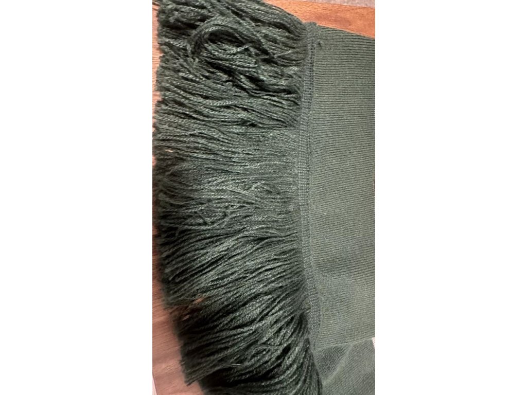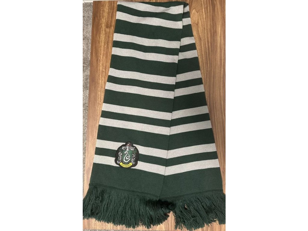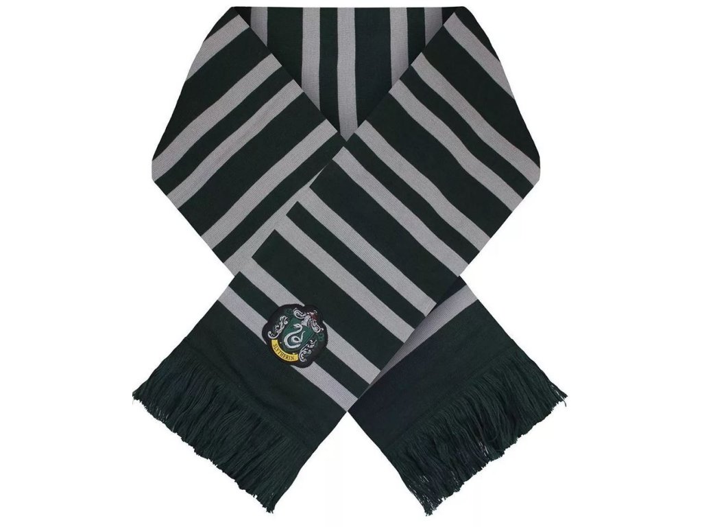 Atraktivní zeleno-bílá šála s třásněmi a erbem školní koleje Slytherin.