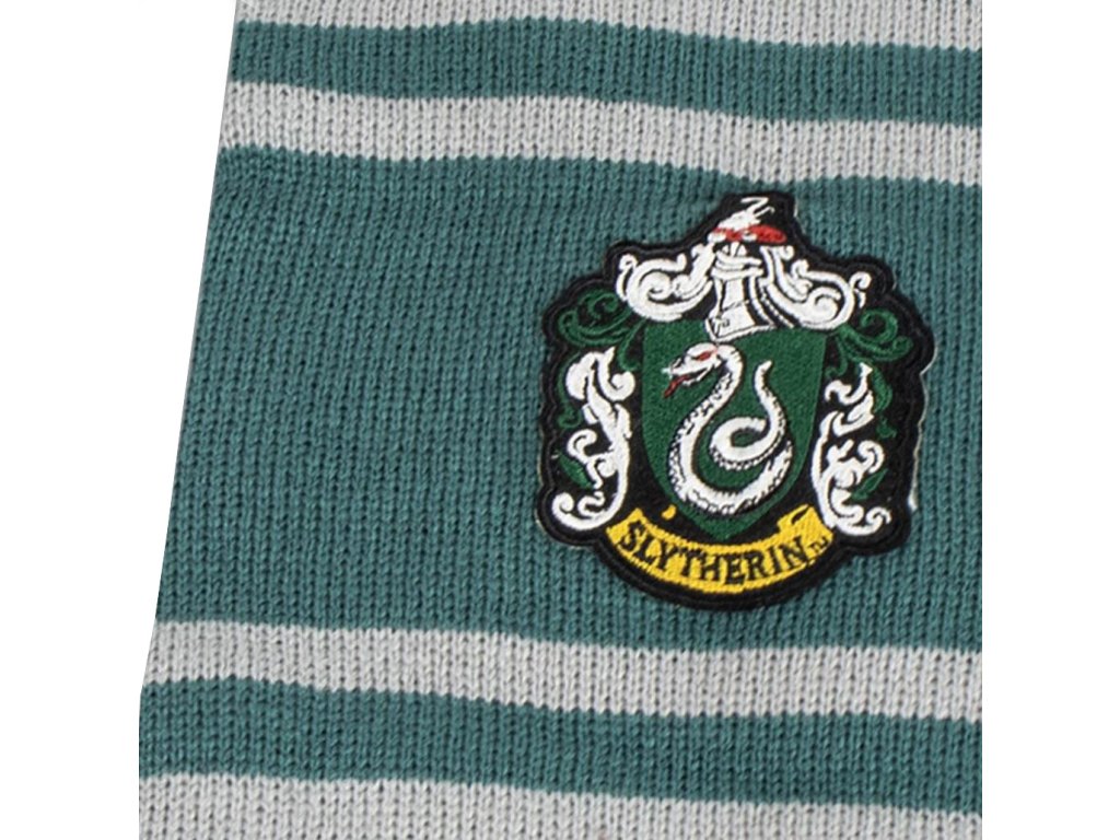 Zelená pletená šála s logem a znakem v barvách školní koleje Zmijozel z filmové kouzelnické ságy Harry Potter. Vhodná na běžné nošení v zimě na zahřátí, ale i jako sběratatelský předmět pro všechny fanoušky filmu, zejména fanoušky koleje Zmijozel a záporáka Draca Malfoe.