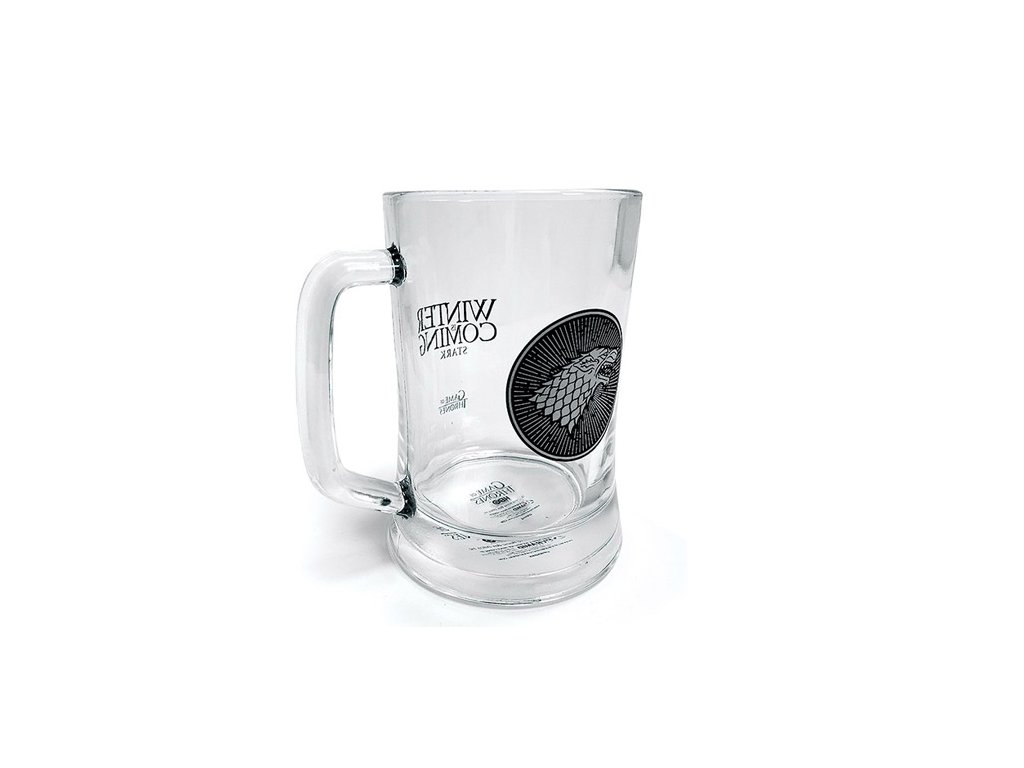 Oficiální korbel z katalogu produktů s logem, fotografiemi a grafikou populárního amerického fantasy dramatického seriálu Game of Thrones.