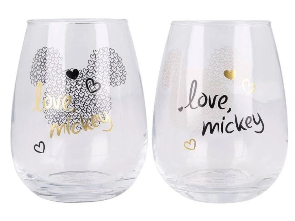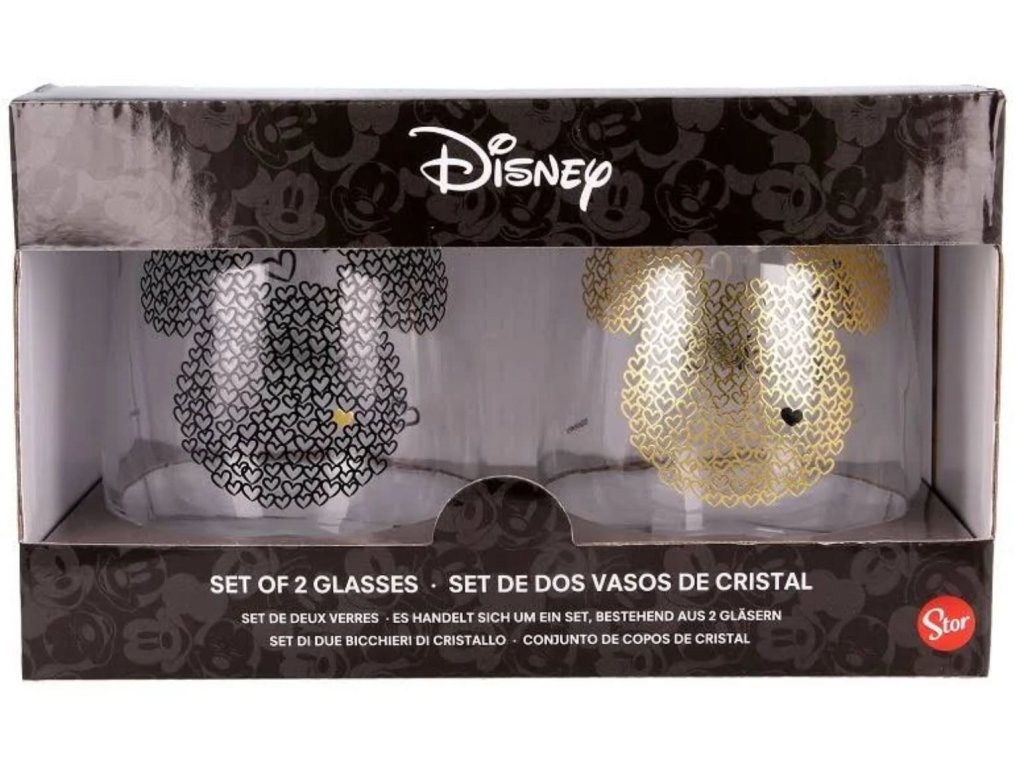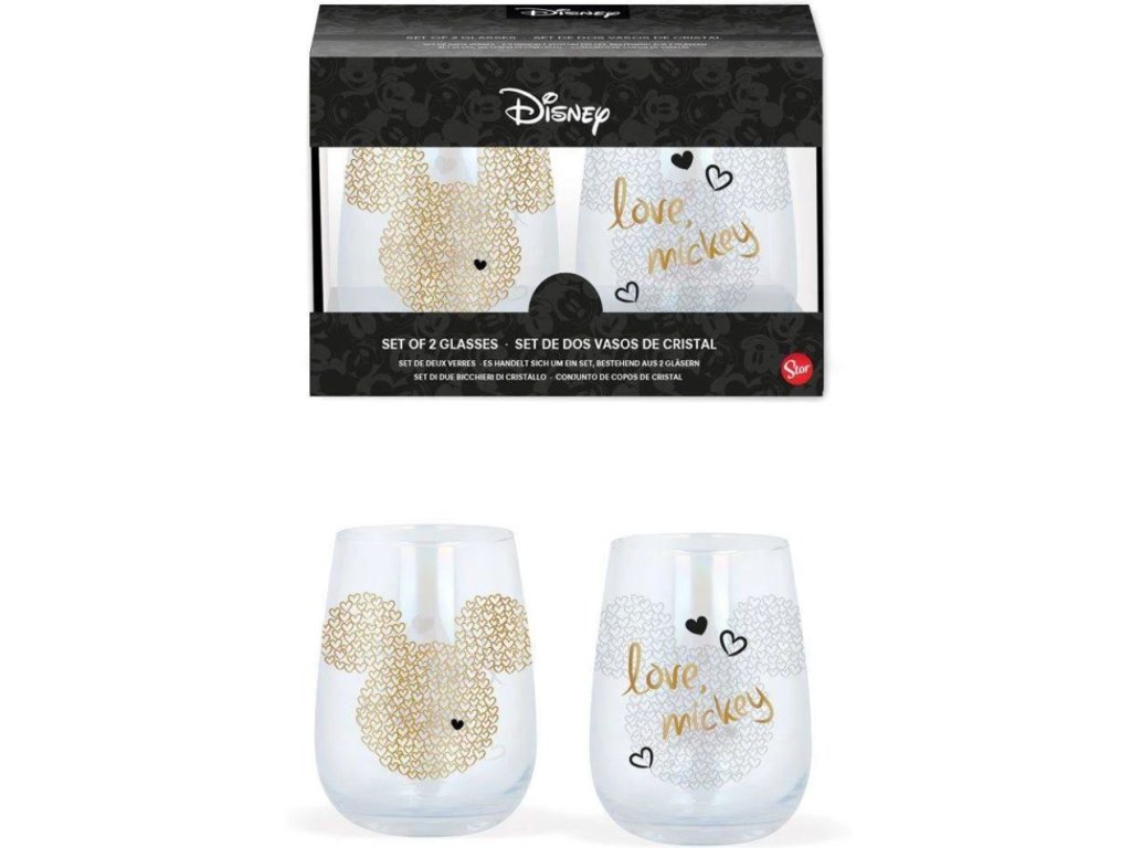 Balení dvou kusů sklenic se zlatými a černými prvky inspirované postavičkou Mickey Mouse. Skleničky mají roztomilý design vyvedený jako hlava Mickeyho z jedné strany a nápisy ,, Love Mickey" se strany druhé. Sklenice jsou baleny v krabičce a jsou tak vhodné i jako dárek pro všechny příznivce této postavičky.