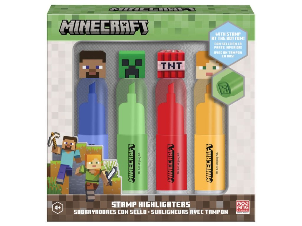 Set 4 barevných zvýrazňovačů s grafikou postav Creepera, Alex, Steva a TNT z počítačové hry Minecraft. Každá barva jednotlivého zvýrazňovače má svůj vlastní osobitý topper ve tvraru kostky vyvedené podle ikonických postav či doplňků videohry. Zvýrazňovače jsou zabalené v dárkové krabici, a jsou tak vhodné i jako drobný praktický dárek do školy, či kanceláře.