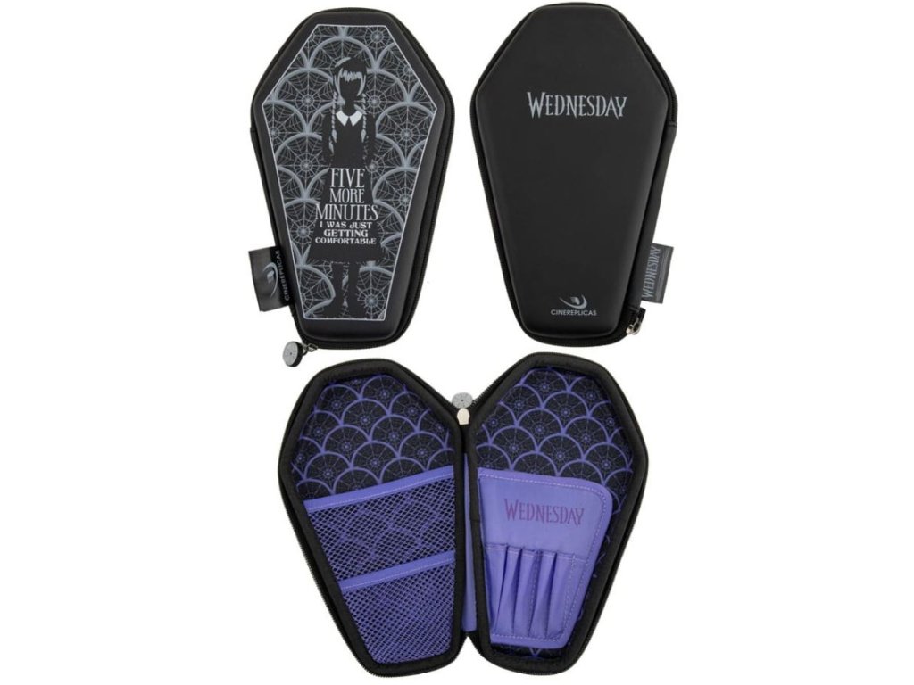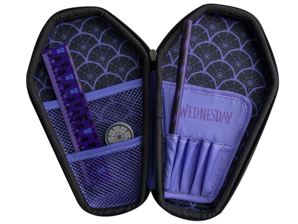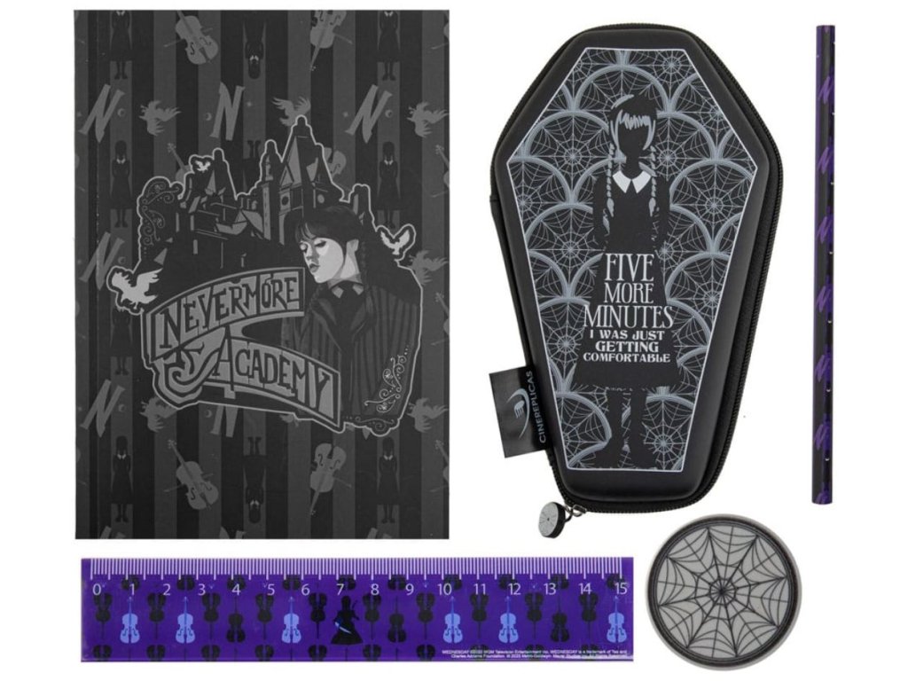 Oficiální produkt - školní set pomůcek z katalogu zboží s grafikou, logem a licencí populárního hororového seriálu Wednesday od společnosti Netflix.