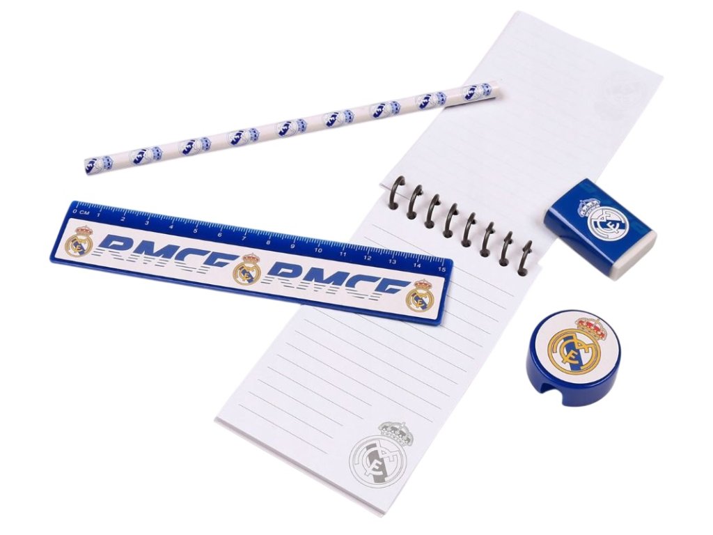 Set školních pomůcek s grafikou hlavního loga fotbalového týmu FC Real Madrid. Set je vhodným dárkem pro každého menšího i většího školáka a milovníka fotbalu, který si chce zapisovat všechny taktiky a herní tahy.