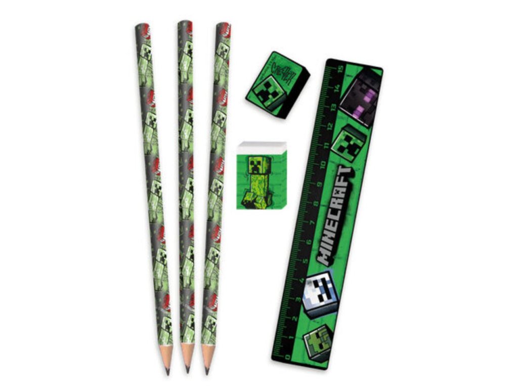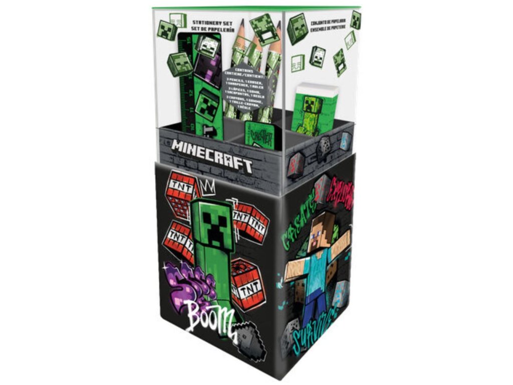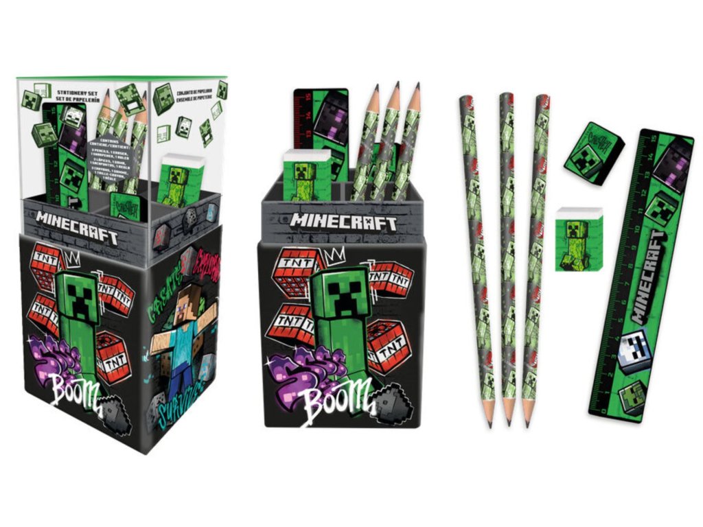 Praktický set školních potřeb s motivy z populární videohry Minecraft potěší každého fanouška tohoto kostičkovaného světa. Stylový stojánek s grafikou Creepera a TNT udrží všechny pomůcky přehledně na jednom místě a dodá pracovnímu stolu originální herní vzhled. Kompletní výbava pro každý školní den a skvělý tip na dárek pro fanoušky Minecraftu k narozeninám, Vánocům nebo na začátek školního roku.