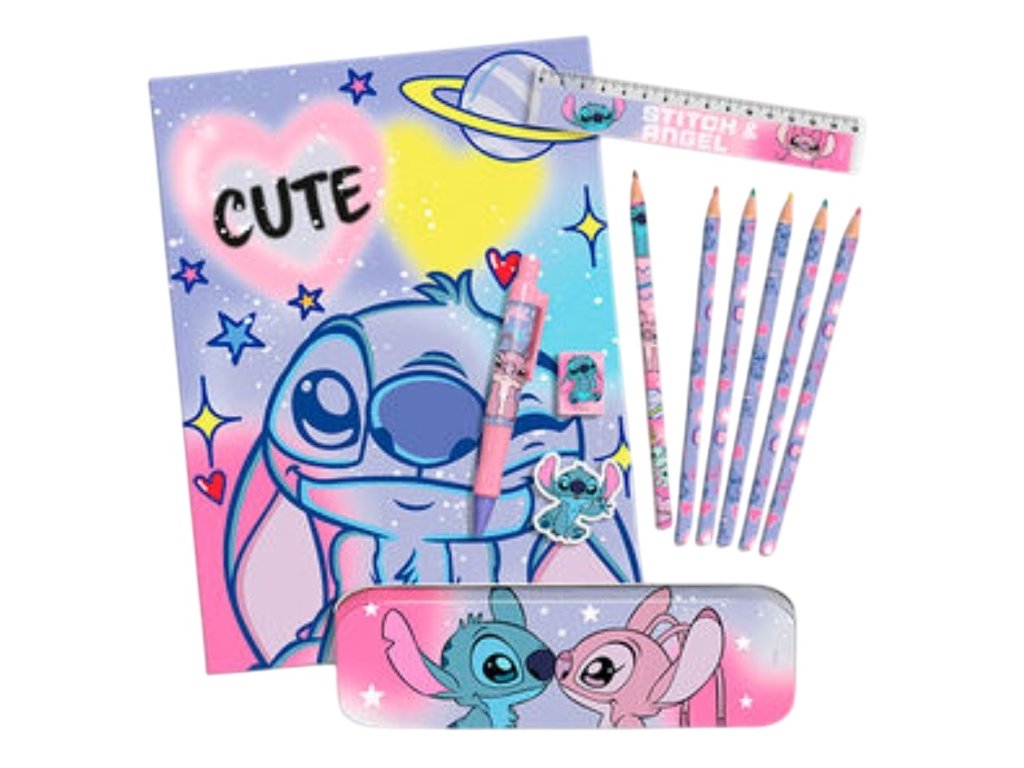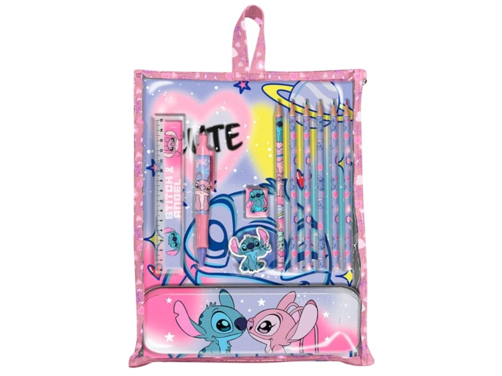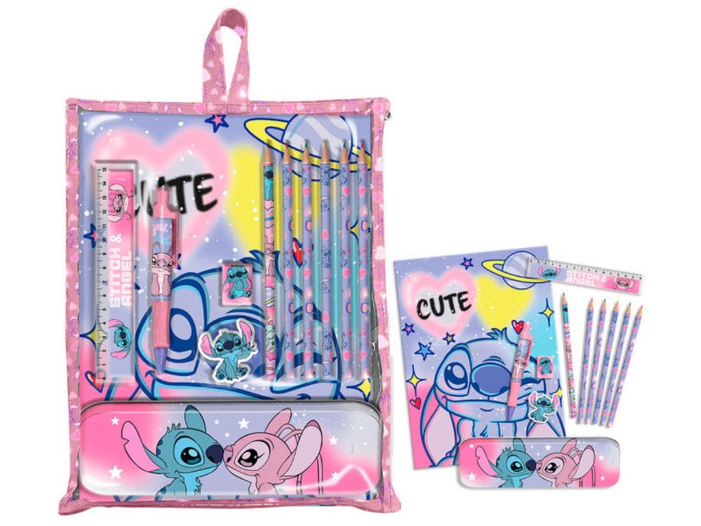 Set školních pomůcek s motivem roztomilého mimozemšťana Stitche a Angel z pohádky Lilo & Stitch. Tato sada nabízí vše, co děti potřebují pro zábavné psaní svých školních poznámek. Set je zabalen v praktickém obalu na zip, které je ideální jak do školy, tak na doma. Ideální i jako drobný dárek pro všechny školáky milující postavičku Stitche.
