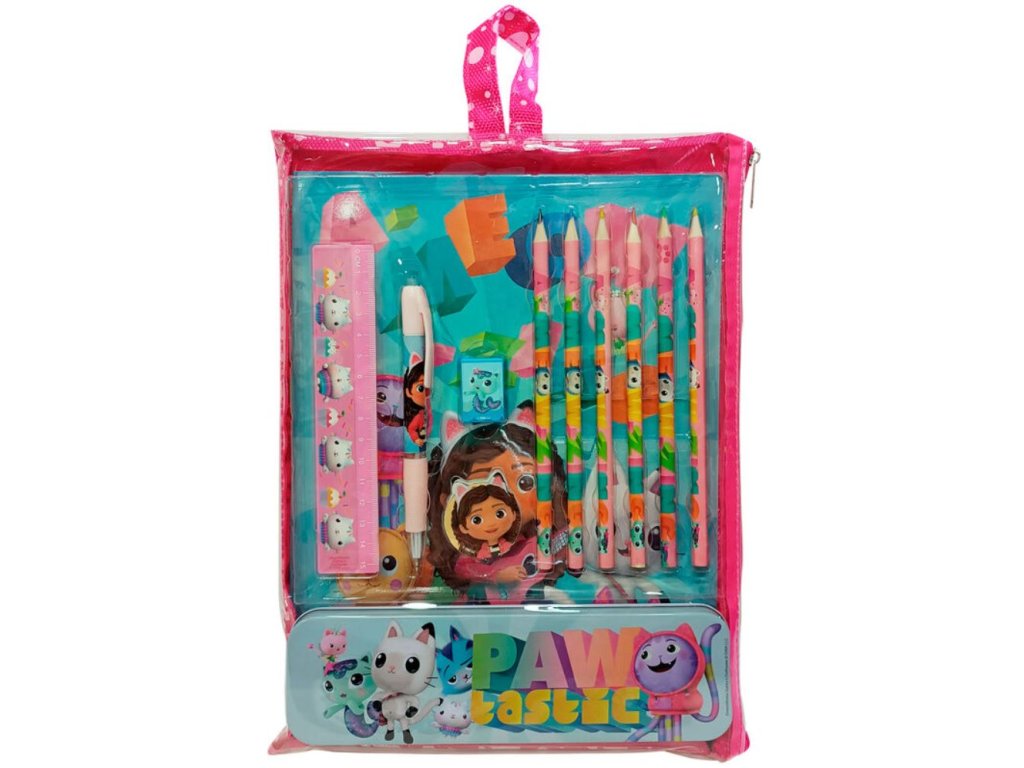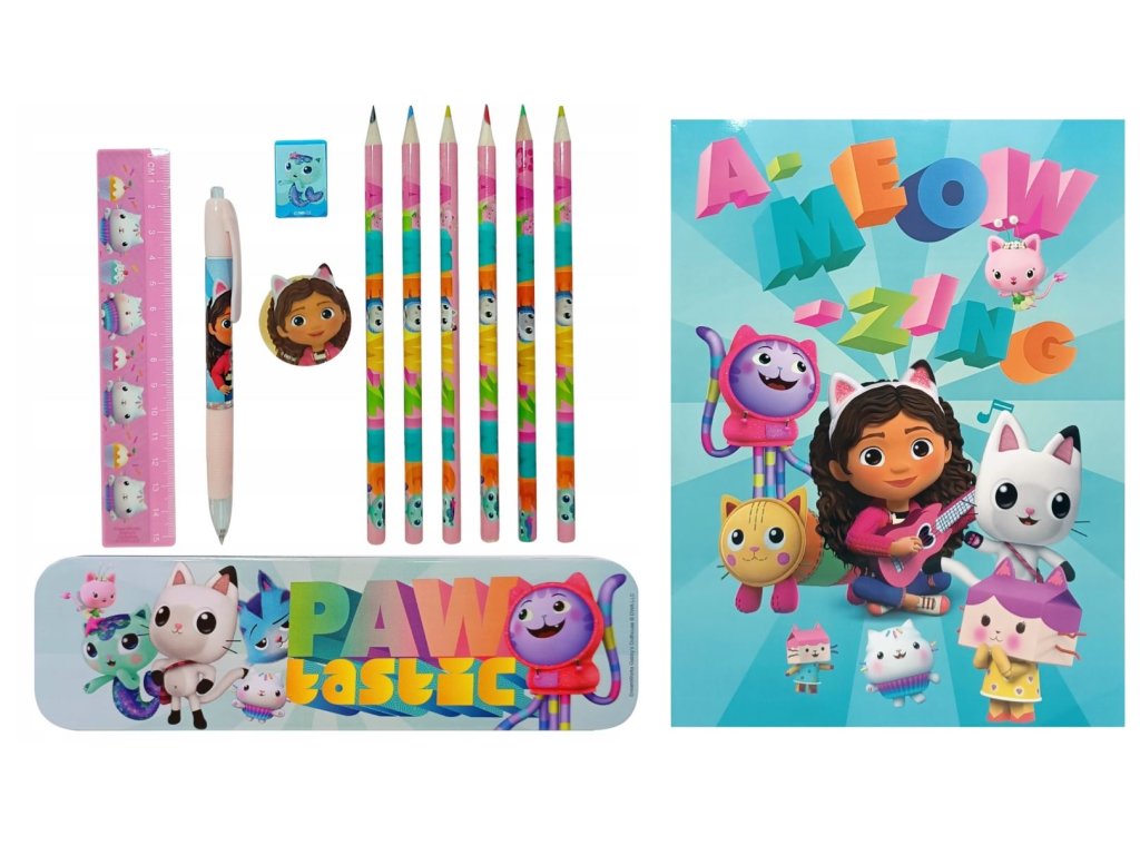 Oficiální produkt - set školních pomůcek z katalogu výrobků s grafikou a licencí populárního dětského seriálu Gabby's dollhouse (Gábinin kouzelný domek).