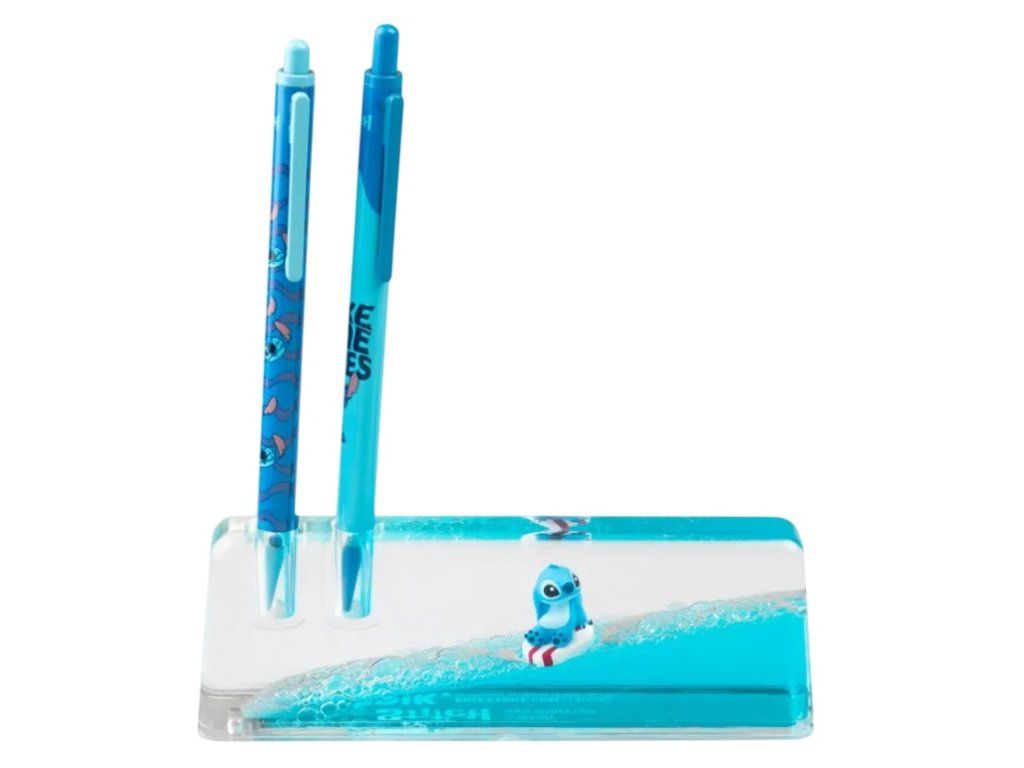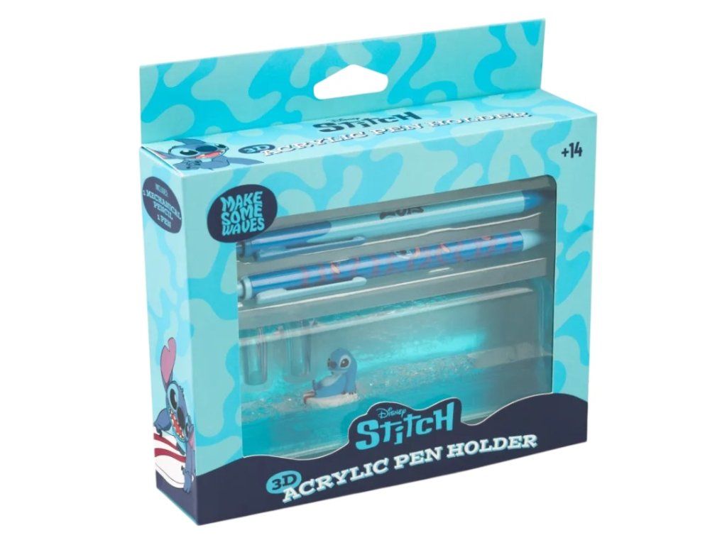 Vneste do svého psaní trochu humoru z pohádky Lilo & Stitch. Tento unikátní tekutý stojánek s roztomilým surfujícím Stitchem není jen obyčejný držák - je to interaktivní podívaná! Díky speciální směsi vody a oleje Stitch uvnitř neustále plave na hladině oceánu. Stačí pohnout stojánkem a sledovat, jak se Stitch mrštně pohybuje. Balení obsahuje stylové kuličkové pero a mechanickou tužku (mikrotužku) na 0,5mm tuhy, obojí v designu inspirovaném pohádkou Lilo a Stitch. Stojánek je vyroben z čirého akrylu, zatímco samotný Stitch je ručně malovaná figurka z polyresinu. Ulovte si svého vlastního surfujícího mimozemšťana přímo na pracovní stůl!