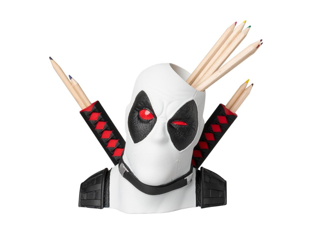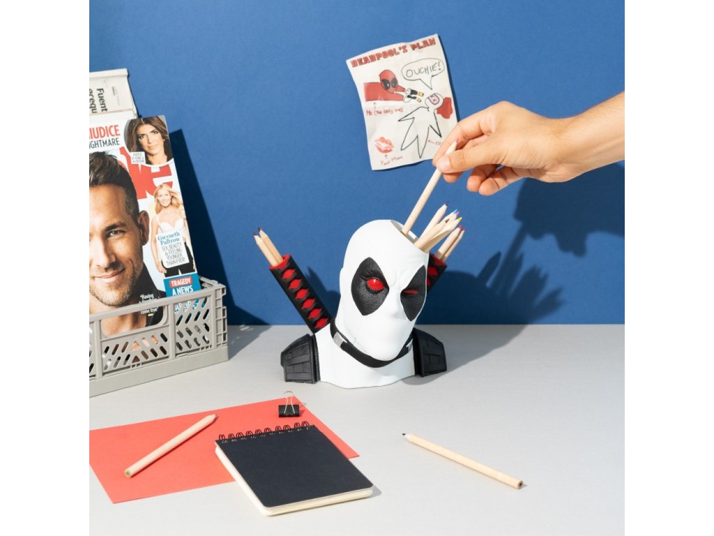 3D držák na pera a psací potřeby. Držák na pera vyvedený z postavy hrdiny Deadpoola z týmu X-Force je ručně malovaný a vyroben z pryskyřice a ABS plastu. Obsahuje tři různé přihrádky, kam si můžete uložit psací potřeby: jednu v horní části hlavy a další dvě v jílci katany. Stojánek pro všechny menší i větší fanoušky, kteří chtějí své propisky mít organizované ve stylu.