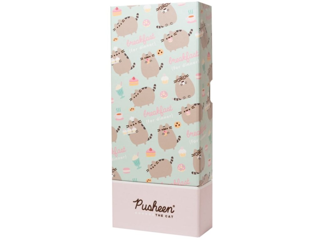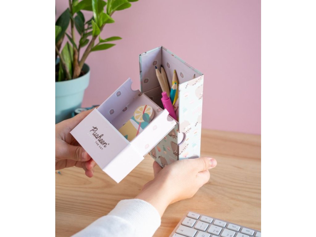 Kartonový stojánek na tužky se zarážkama sloužící jako držák na mobilní telefon vyvedený v designu roztomilé kočičky Pusheen. Desky jsou vyrobeny z tvrdého kartonu, které lze zavřít a tím pádem lze tento stojánek používat i jako penál, či úložná krabice na psací či jiné potřeby. Vhodné i jako dárek pro všechny školáky, ale i starší fanoušky této roztomilé kočičky.
