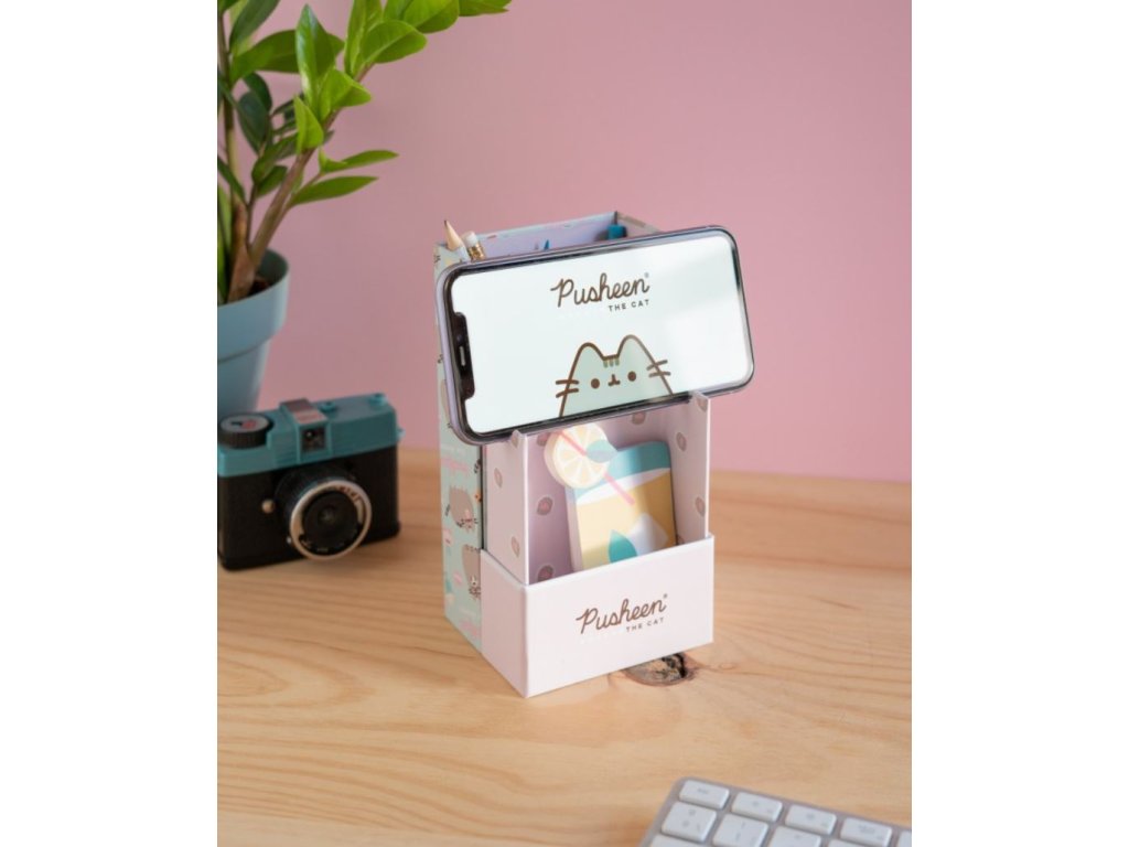 Oficiální produkt - stojánek na tužky s držákem na mobilní telefon z katalogu kancelářského zboží s grafikou a licencí populární kočičky Pusheen.