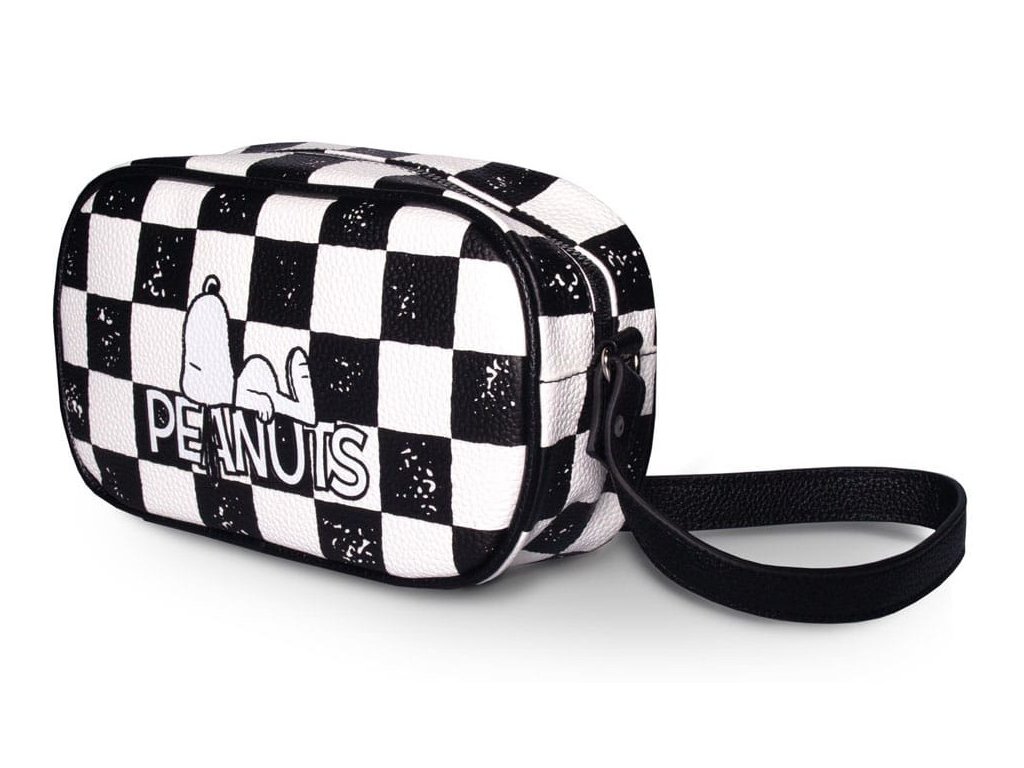 Černá dámská crossbody kabelka v nádherném šachovnickém designu oblíbeného psa Snoopyho.