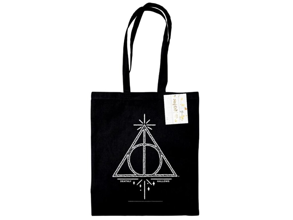 Řekněte "Ahoj" nádherné černé shopping taštičce s grafikou znaku relikvie smrti ze ságy Harryho Pottera. Tato jedinečná taška dodá vašim každodenním výletům zábavný nádech, díky čemuž je ideálním doplňkem, který vám umožní nosit kousek Harryho Pottera a vychutnávat si svérázné kouzlo, ať jste kdekoli.