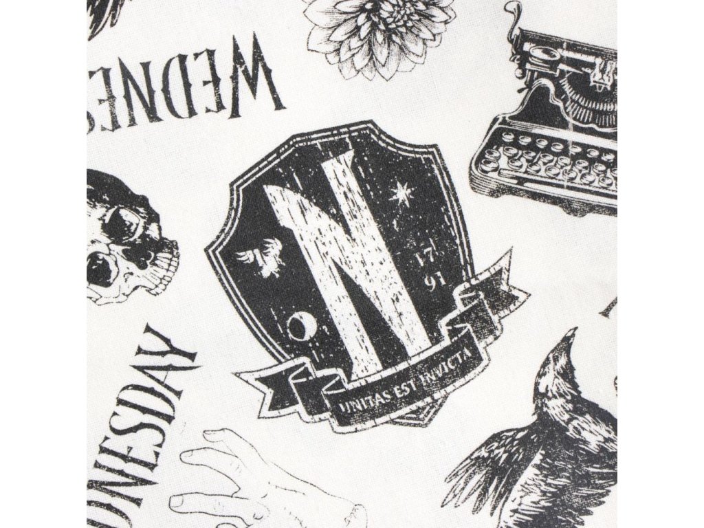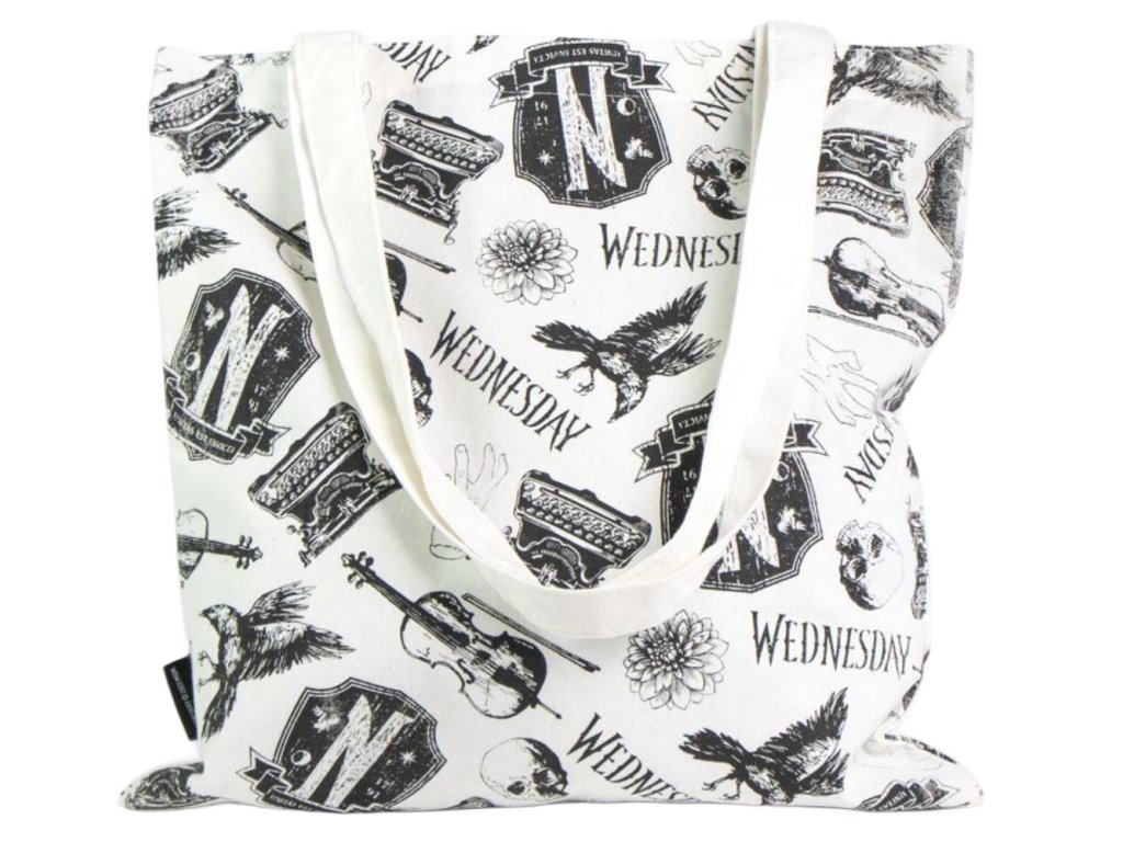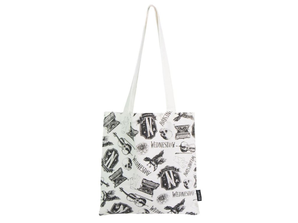 Bílá shopping taška s grafikou ikon ze seriálu Wednesday. Taška je vhodná nejen na nákupy, ale také lze nosit i jako kabelka na rameno. Tato taška je nutností každého fanouška tohoto oblíbeného mysteriózního seriálu.