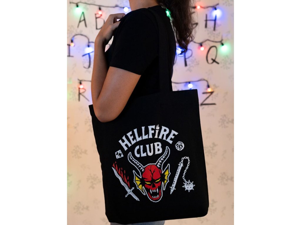 Černá shopping taška na rameno inspirovaná Hellfire Clubem z oblíbeného amerického sci-fi mysteriózního seriálu Stranger Things.