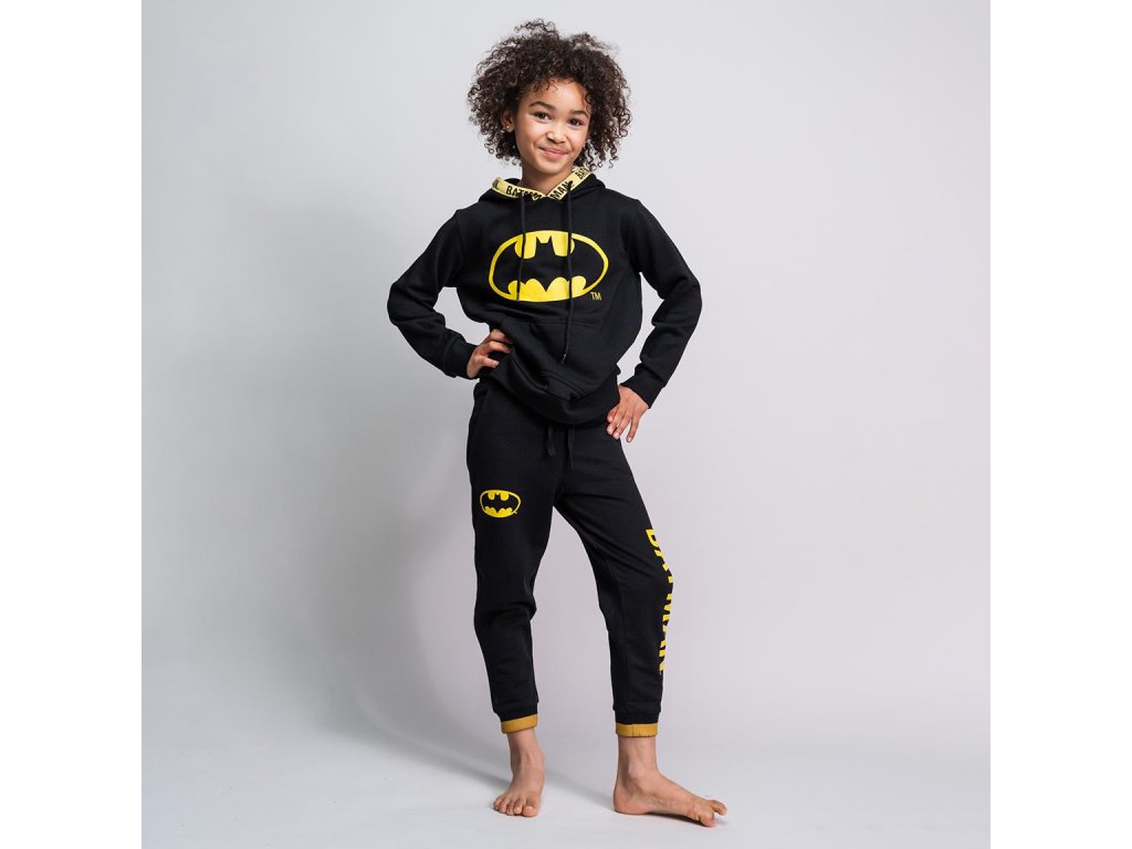 Černé dětské tepláky vyvedené s grafikou žlutého symbolu Batmana a žlutého nápisu: ,,Batman''. Tepláky jsou vhodným doplňkem každého fanouška, který se odteď nebude stydět zachraňovat město i po domácku.
