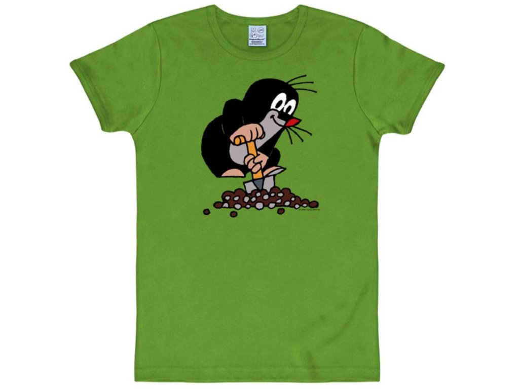 Dámské tričko s krátkým rukávem ve světle olivové barvě s motivem Krtečka, který kope do země. Přiléhavý střih, příjemný bavlněný materiál, vhodné na volný čas i každodenní nošení.
