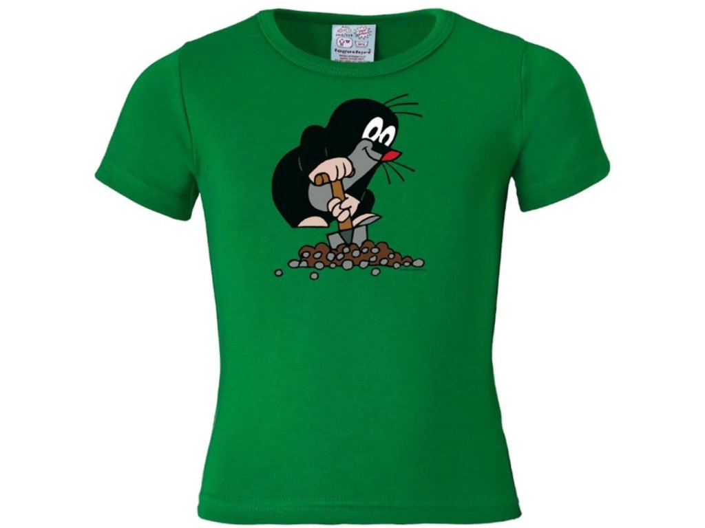 Zelené dětské tričko s grafickým potiskem Krtečka s rýčem. Tričko je vhodné pro všechny menší i větší fanoušky této pohádky.