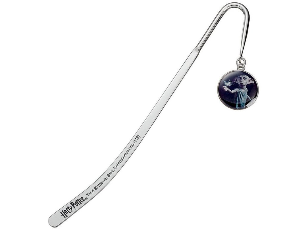 Stříbrná záložka na knížky s grafikou filmové ságy o Harrym Potterovi s přívěškem Dobbyho.