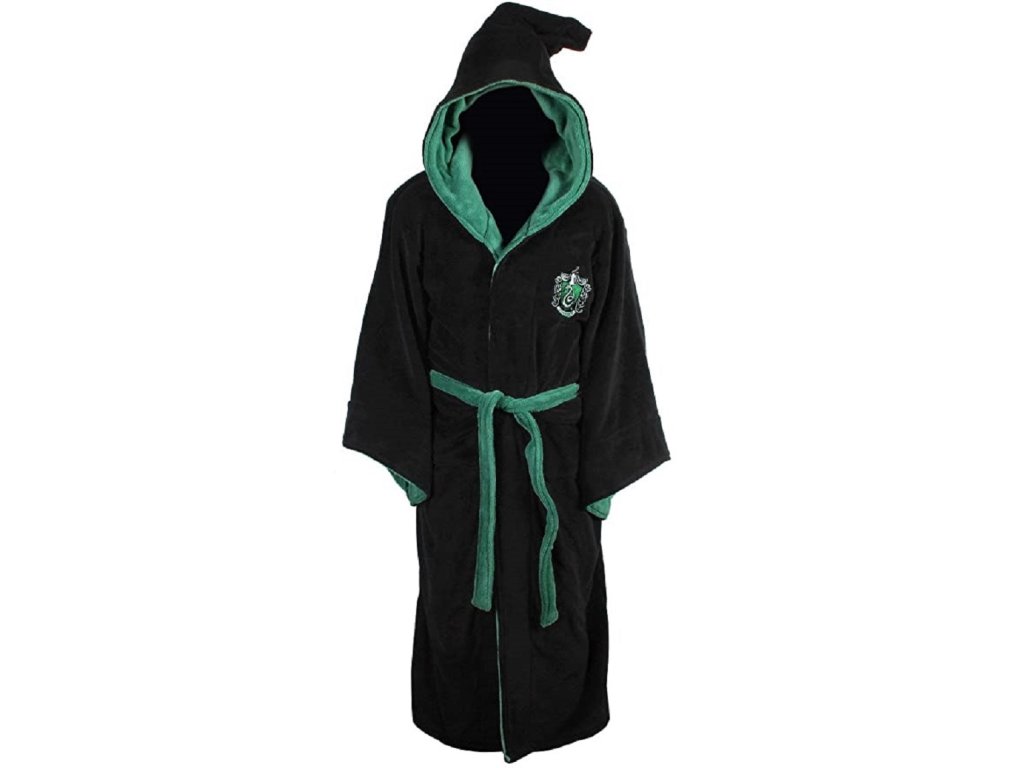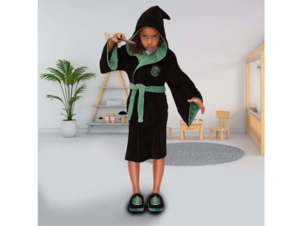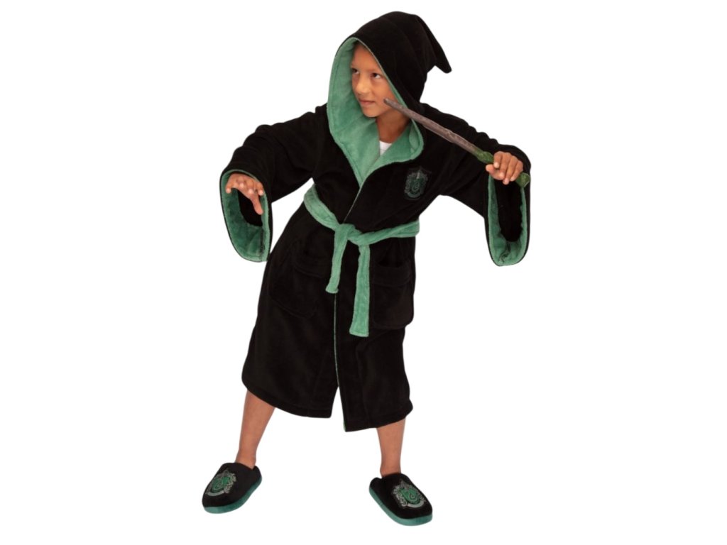 Kvalitní černý dětský župan inspirovaný kolejí Zmijozel z kouzelnické série Harry Potter. Na hrudi se vyjímá nášivka s erbem Zmijozelské koleje, zatímco zelený pásek a kontrastní zelený vnitřek dodávají županu autentický vzhled kouzelnického hábitu. Velká špičatá kapuce a rukávy do zvonového tvaru podtrhují jeho magický charakter. Župan je vyroben z kvalitního polyesteru, který je příjemný na dotek a zajišťuje maximální pohodlí při nošení i lenošení na gauči. Ideální dárek pro fanoušky Harryho Pottera do chladných večerů.